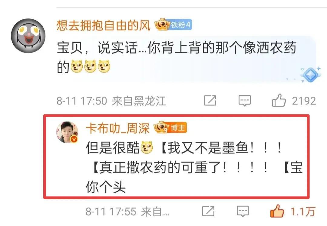 周深不会真的背过这个东西吧! 在农村长大的一般都经历过,那个东西要装满水,农药,可重了! 第一场这个服装一出来的时候就有人说,像打农药的[笑哭],不愧是小王的代言人! 但是!这个是什么?我还真没看懂,感觉有点太大了! 昨天有人评论区问周深了! 周深:嫑深章! [笑哭][笑哭][笑哭] #周深#