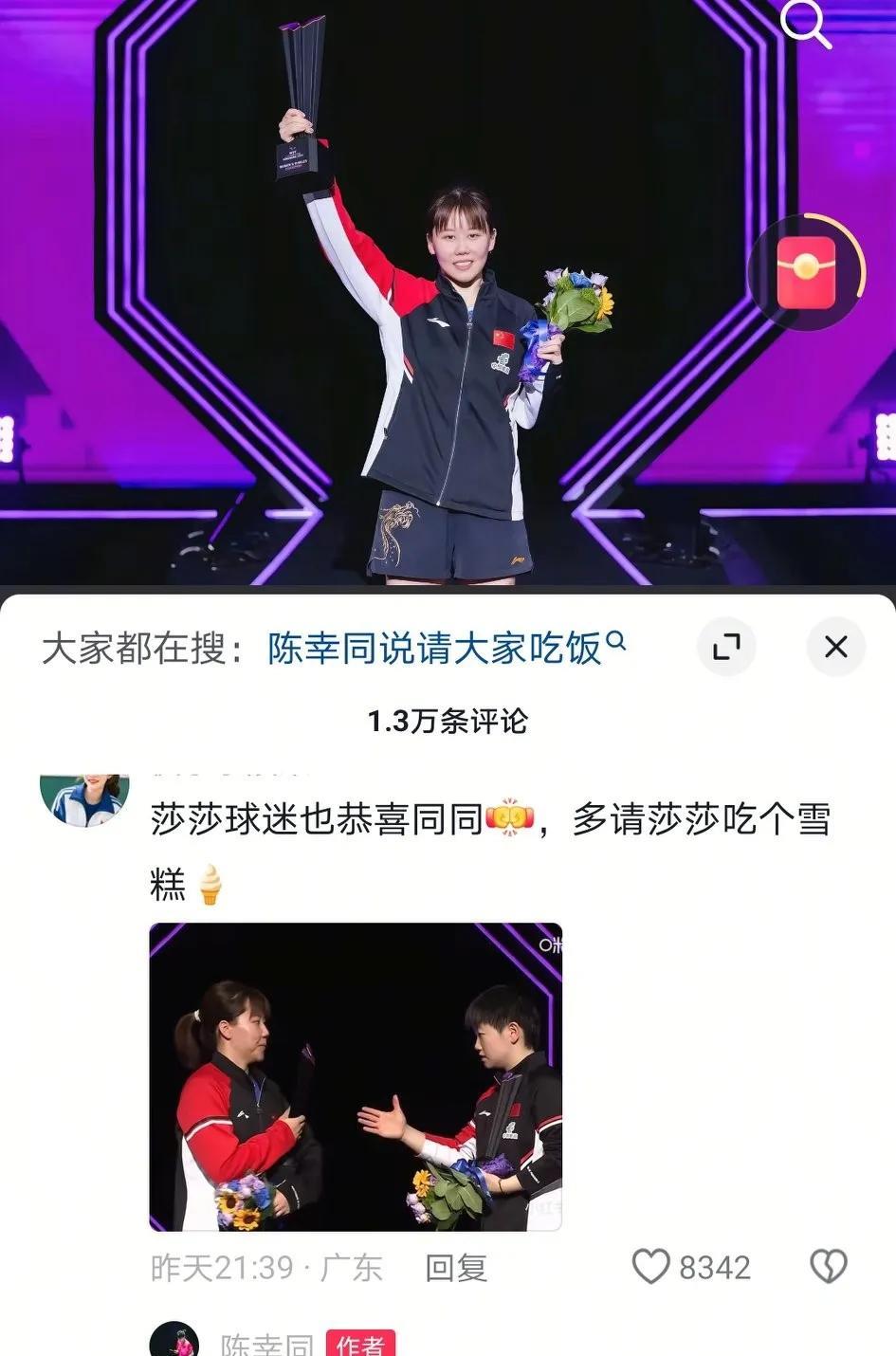 陈幸同穿搭也很时尚啊。 这次横滨冠军赛,陈幸同夺得女单冠军,这是她职业生涯里获得的首个WTT冠军赛的冠军,也是自己的一个突破吧。赛后采访主持人问同同要怎么庆祝,同同说回去请大家吃饭。 这不,赛后陈幸同发文庆祝夺冠,也PS了一下:回去请大家吃饭,还可爱的配了一个机器人的表情包。昨天国乒队员们没有飞瑞典,而是先从横滨回北京了,看到周启豪也给同同留言,他夸同同优秀,大家说启豪也来秀恩爱了。 同同人还在日本,大家在评论区里就开始排队等着同同请吃饭了。看到有个网友说:“莎莎球迷也恭喜同同,多请莎莎吃个雪糕”,陈幸同回复说莎莎随便选,这样的氛围真好。 昨天傍晚,国乒队员们抵达北京,看到陈幸同和朱思冰一起走出机场,陈幸同这身穿搭很时尚,这条牛仔裤不错。刚出机场就和朋友来了一个拥抱,有朋友来接机了,肯定是晚上一起吃饭,庆祝同同这次夺冠,拿了冠军真好,大家都开心!