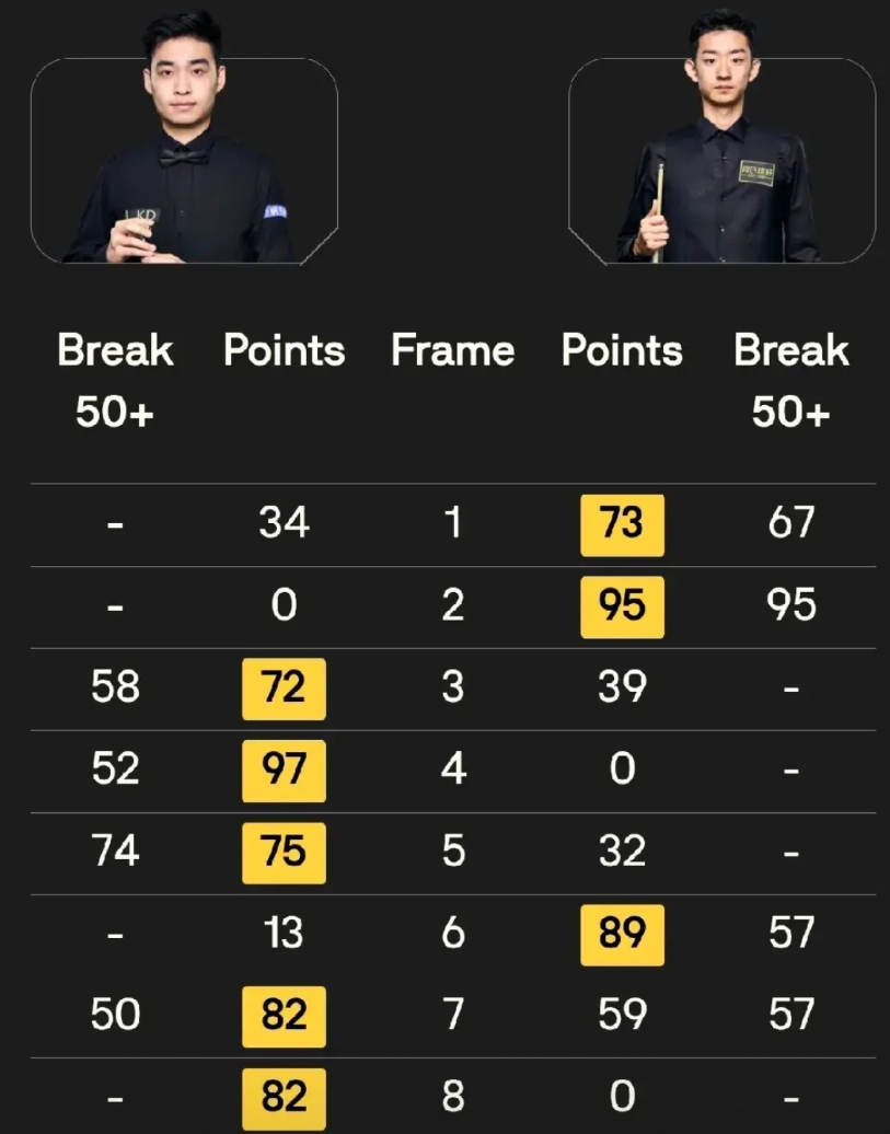 冰火两重天,上半区全军覆没,下半区大获全胜,四位中国球员闯进沙特大师赛十六强[赞] 赵心童再现强者风采,打出两杆过百三杆90+,仅用一个小时零封黑马沃尔霍斯,下一轮三打韦克林。 丁俊晖尽管只打出两杆50+,但架不住马奎尔频频送礼,多次捡漏以5-2淘汰本赛季首站排名赛冠军,下一场遭遇霍金斯,主任还要加油哦。 小将常冰玉大有一黑到底的趋势,再次上演决胜局逆转绝杀的好戏,硬是将打出一杆破百四杆50+的艾伦“熬死了”,堪称“决胜局之王”,前途不可限量,下一场对阵火箭更是真正检验其心理抗压能力的硬仗。 斯佳辉是真的能打硬仗,每逢大赛便能稳定输出,上届沙特大师赛就闯进了四强,今天的德比战也是表现不俗,四杆50+将小兄弟吴宜泽淘汰出局,下一场再次挑战囧哥威尔逊,希望不会重蹈上海大师赛的覆辙。