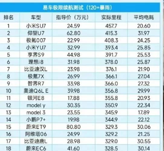 已测完测试的结果。易车网测试的结果。小米又活到了第一。 从这个表上可以看出小米汽车的续航里程是450km,能耗是20,价格是24.59万。特斯拉的续航是350km,能耗是22,价格是30.35万。 为什么许多人还认为小米比不了特斯拉呢? 更让人不可思议的是那款爱国车,续航只有320km,能耗高达33,价钱却高达569800元,而且很多人还高兴的买?许多国人还为它摇旗呐喊。真不知道这些人是怎么想的?