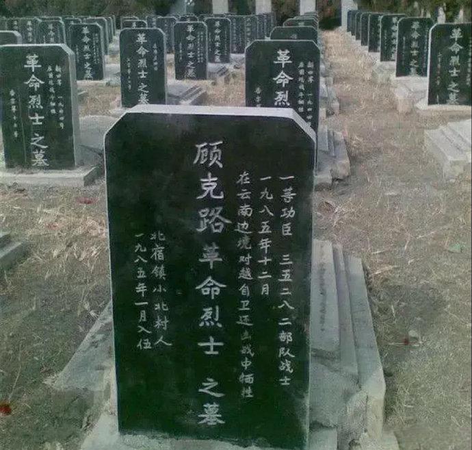 顾克路,1984年入伍,二月个后开起老山前线,这是上前线前顾克路的遗言。 “青春是美好的,生命是可贵的,我一个17岁的青年,向往未来,热爱生活,因为我还很年轻,我漫长的人生道路上还有许多美好的憧憬,但是祖国和人民如果需要我把生命献出,我将毫不犹豫的把鲜血洒尽。” 1985年11月,17岁的顾克路被选为连队的爆破手。 1985年12月2日,598团分三个梯队向211高地发起攻击。顾克路所在突击队负责从左翼直插越军占领的604主峰,然而当顾克路好不容易突破越军火力网后,却被背后隐藏的暗堡里的敌军击中大腿,四颗机枪子弹以顾克路大脚穿过,简单包扎后,顾克路继续向暗堡爬行。 突然一颗炮弹落在顾克路身旁,顾克路被炮弹炸起了3、4米高,他的左大腿直接被炸飞,顾克路被重重的甩在地上,几分钟后,顾克路清醒了,左大腿的鲜血还在流着,此时他没有选择后退,只见他打开急救包,用止血皮筋将左大腿紧紧扎住,又慢慢地向暗堡爬去,时间就这样一分一秒的过去了,顾克路终于爬到了暗堡下面,他拼尽最后一点力气,把手雷扔进了暗堡。 战斗结束后,顾克路握着枪,躺在暗堡旁,手中的枪握着铁紧不愿松开。 顾克路牺牲时刚好17岁,后被授于一等功臣称号。