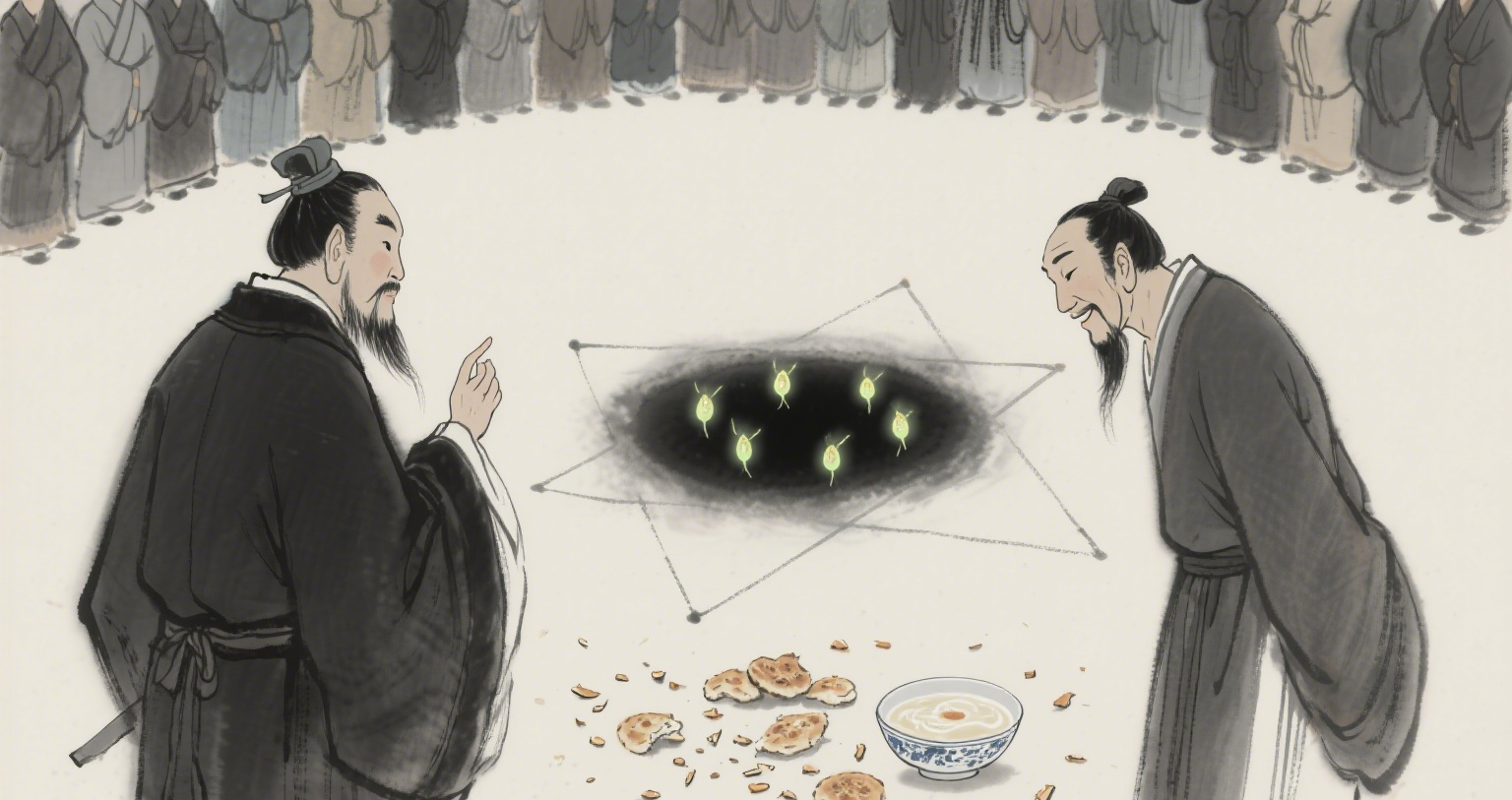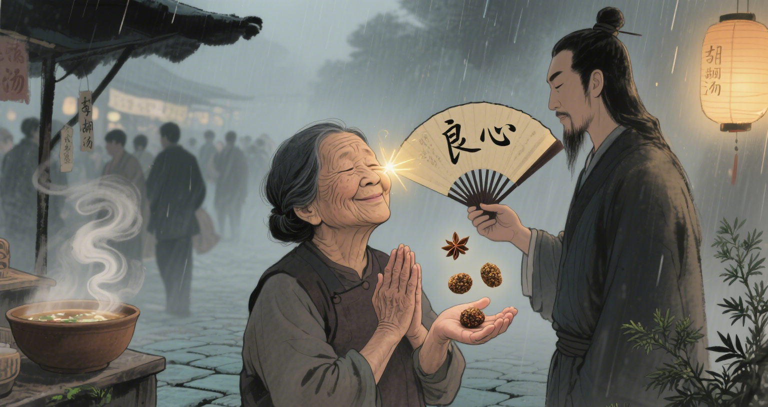 “死人摆摊,活人敢算吗?” 淇县七月半的夜市,油锅“滋啦”一声刚响,卖炸面筋的老王就吓得把笊篱扔了。 比干,那个没心的老丞相,正坐在豆腐脑摊后头,胸口一个大黑窟窿,手里却摇着一把小折扇,扇面写着俩字:“良心”。 老王腿肚子转筋:“姜……姜爷,您老快管管!” 姜子牙正蹲在隔壁摊啃烧饼夹驴肉,油顺着白胡子往下滴。 他瞟一眼:“慌啥?他收良心,又不是要命。” 比干笑眯眯招呼:“各位父老,今日不算钱,只算良心。谁要是心里没亏欠,白送一碗豆腐脑;谁要是欠了,留下一句真心话。” 人群轰一下围成圈。 第一个坐下的是卖胡辣汤的李婶,她搓着手:“俺去年多找人家十块钱,心里老翻腾。” 比干拿扇子在她脑门一点,李婶“哎呀”一声,手里竟多出一张皱巴巴的十块票子,上头还沾着去年的胡椒面。 第二个是放羊的张二狗,他梗着脖子:“我偷过东家的羊!” 比干窟窿里忽然伸出一只白手,把二狗的心口拍得“咚咚”响:“羊早还了,你心里还有债?” 二狗脸一红,从兜里摸出三枚铜钱,“咣”扔进比干窟窿。 窟窿里“哗啦啦”响,竟掉出一把酸枣,正是当年纣王逼他种的那棵。 人群越围越密。 姜子牙啃完最后一口驴肉,抹抹嘴:“老伙计,别卖关子了。你是想借良心补心吧?” 比干叹气:“三千年前,我拿七窍玲珑心换纣王一句忠,结果心被挖了,忠也喂了狗。如今黄河改道,冲垮我旧庙,只剩一块比干碑。我想通了,忠不忠,得看百姓认不认。” 他忽然站起来,窟窿里飘出七颗光点,像萤火虫,绕着夜市飞了一圈,最后落在每个摊位最不起眼的角落: 老王油锅下的煤球、李婶汤桶里的木勺、二狗羊鞭上的红绳…… “这些,是我当年种下的忠种。”比干声音发颤,“它们长成了你们的良心。今天,我把它们还给你们。” 话音未落,他的身影开始透明,像被风吹散的纸灰。 姜子牙赶紧甩出一张黄符,却扑了个空。 只听见远远传来一句:“老姜,欠你的封神榜,下辈子再还!” 第二天淇县夜市照常开张。 老王发现油锅里的油格外清亮,李婶的胡辣汤咸淡刚好,二狗的羊再没丢过。 最怪的是,比干碑前多了个小石槽,里头永远有七颗酸枣,谁要是心里犯嘀咕,嚼一颗,酸甜自知。 比干没心,却把忠种在了柴米油盐里。 姜子牙说得好:“神不神的不重要,老百姓心里亮堂,比啥心都管用。” 往后每年七月半,淇县人都会往石槽里扔一把酸枣,算是给比干续点“良心电费”。 毕竟,良心这玩意儿,停电了谁都黑。
