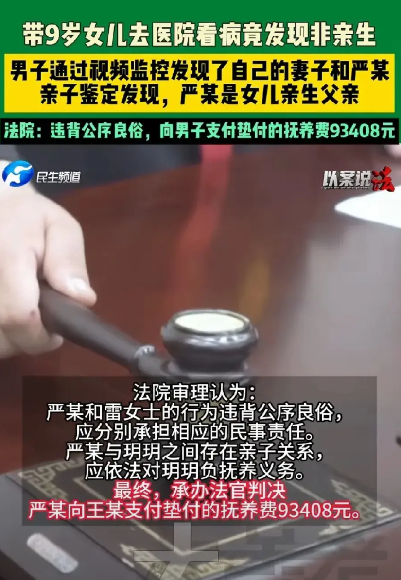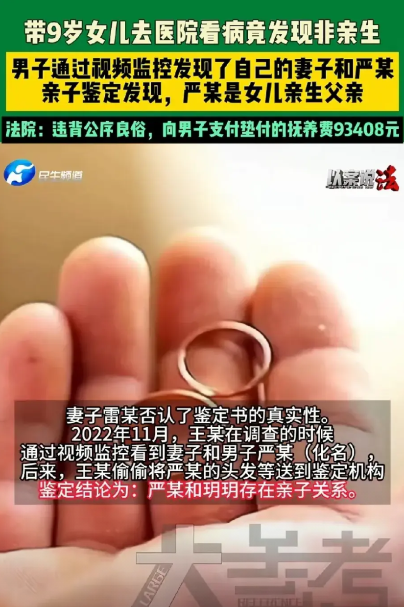 湖北枣阳,男子带9岁女儿去医院看病时,发现女儿血型与自己不匹配,男子越想越不对,赶紧做了亲子鉴定,结果显示,女儿果然不是他亲生的。同床共枕的妻子竟给自己戴了这么大一顶绿帽子,男子气炸了,开始暗中调查,很快在监控视频发现了妻子的秘密,也找到了孩子的亲生父亲。为了出这口恶气,男子将妻子和第 三者告上法庭,索赔11万。