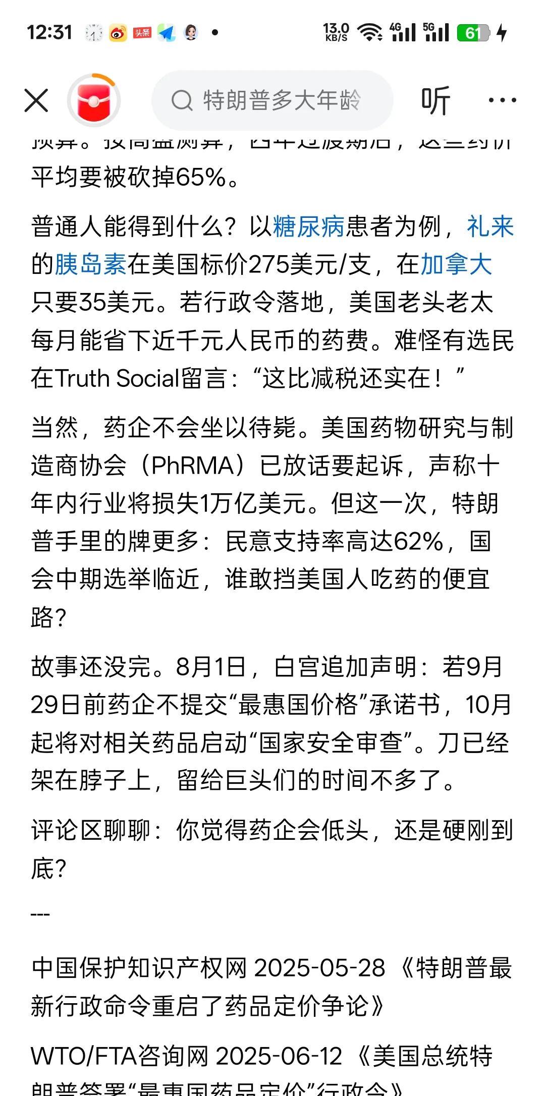 特朗普要求美国药企大幅度降价,要求给美国和其它国家一样低的价格,否则就别在美国卖了。 特朗普指责药企在美国卖的药物价格是欧洲的十几倍甚至几十倍,占全球5%的总人口的美国,却贡献了药企75%利润。 特朗普也非常好奇:为什么同一家药企生产的同一种药物,在美国的价格远远高于其它国家? 糖尿病用的胰岛素,在美国的价格是275美元一支,在加拿大却只要35美元一支。 乳腺癌药在美国卖1.6万美元一盒,瑞典只要1600美元一盒。 以PD-1抗癌药为例,在美国一年费用是110万元一年,在国内只需要十几万元。 原因很简单因为美国不干预药企定价,药企新研制出来的药物会优先在美国上市,因为美国人收入普遍高于欧洲和其它国家,所以药企在美国市场价格要远远高于其它国家和地区。