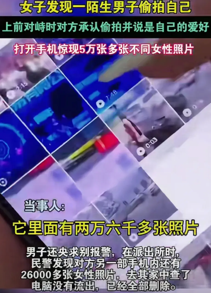 女子要报警,男子表示马上删除,可当男子打开手机时,女子发现里面有众多女子的照片,从拍摄角度看,都像是偷拍的。