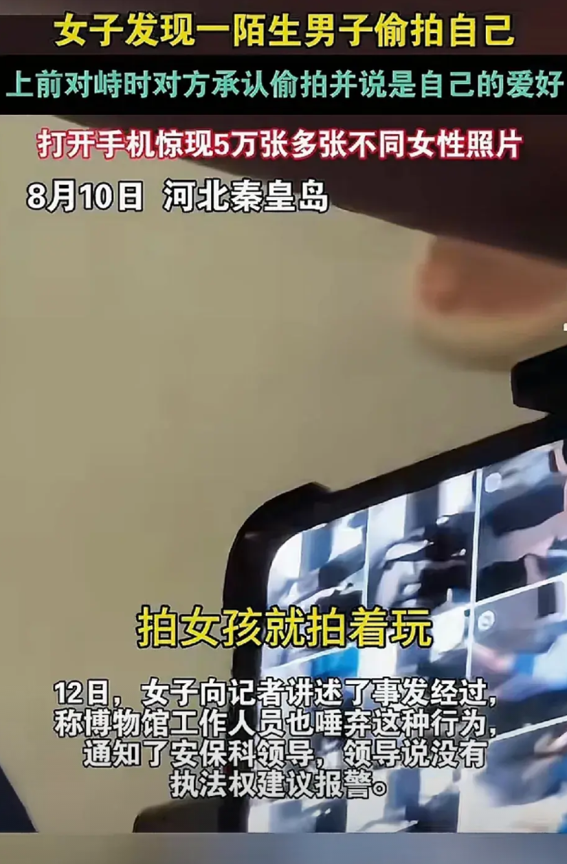 河北秦皇岛,女子在逛博物馆之时,发觉有一名男子正拿着手机拍摄她。女子走上前去问男子:“你为何拍我?”