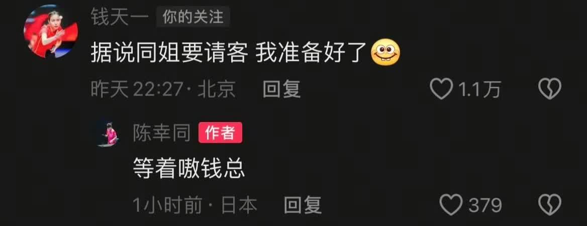 8.11陈幸同社媒发文后,七号,老钱,张瑞都留言,准备好聚餐啦[捂脸] 周启豪:优秀 钱天一:据说同姐要请客 我准备好了 陈幸同:等着嗷钱总 张瑞:据说同姐要请客 我准备好了 陈幸同:哈哈吃素 同同这请客又多了几桌[捂脸],能不能见者有份[耶]