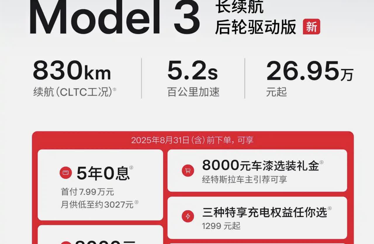 百公里只耗10度电?特斯拉Model 3长续航后驱版上市 在其他品牌都在大张旗鼓为自家新车宣传时,特斯拉又是冷不丁的将Model 3长续航后驱版上市了,此次就一款车型,配备78.4kW·h电池组,CLTC工况续航里程为830公里,新车售价为26.95万。看官方数据,能耗可以说相当低了,不过CLTC懂得都懂,大家觉得新版本的真实续航能去到多少呢?【来自懂车帝车友圈】