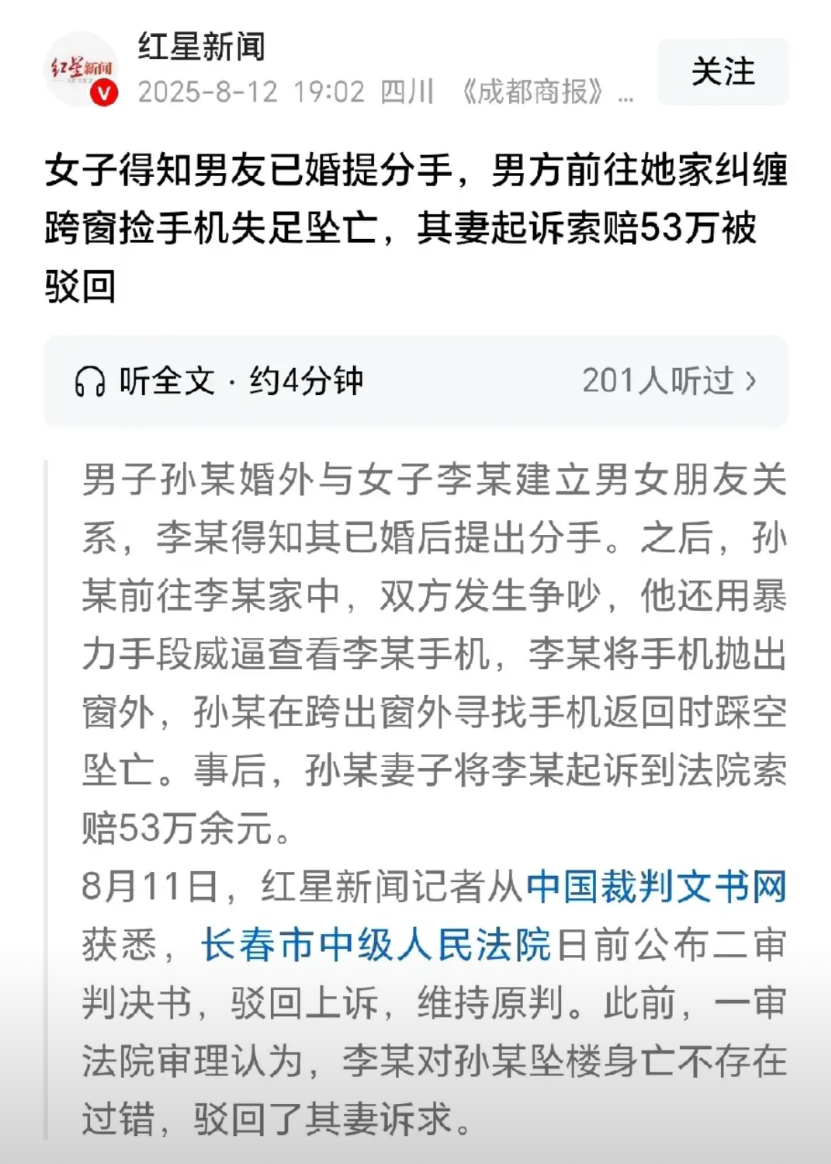 谁死谁有理?吉林长春,女子发现男友竟然早已成婚,背着妻子还和她谈恋爱,女子不愿插足别人的婚姻,提出分手。不料,男友恼羞成怒,不仅砸坏家中财物,还纠缠着要查看女友手机。女子死活不同意,把手机扔出窗外。男友竟然翻窗找手机,不慎从楼上坠落身亡。男友的原配把女子告上法庭,索赔53万,法院这样判!