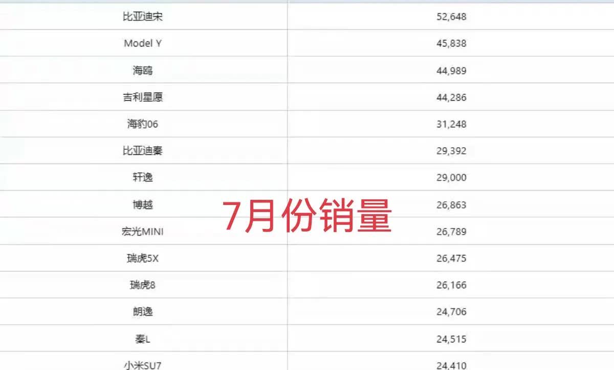 刚刷到一则新闻,7月中国销量最高的车型出炉,排名前五的分别是,比亚迪宋销售52648辆,特斯拉Model Y销售45838辆,海鸥销售以44989辆,吉利星愿销售44286辆,海豹06销售31,248辆。有网友说,销量依旧非常抢眼,比亚迪系列都非常好开省油省心。有网友说,销量是实力最好的证明,比亚迪销量的增长一直稳定! 图片来自网络,侵权请联系我删除!