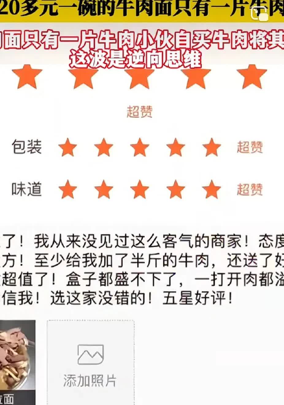 男子20多点了一碗牛肉面,却只有一片牛肉,男子找商家理论,商家说有牛肉,男子自费加满牛肉,晒图五星好评,并配文称:商家很好,至少给加了半斤牛肉。 看完后,网友直呼男子太聪明了,如果直接给差评,商家也就多一个差评而已,但经过男子如此操作,就会收到无数个差评,严重的还容易倒闭,真是杀人诛心呀! 收到好评的商家彻底傻眼了,他怎么也没想,这次竟然遇到硬茬了,当时太低估对方的智商,这下好了,除非男子主动删除评论,否则商家是没有权利删除评论的。 这逆向思维玩的也太溜了,果然还是新脑子好使,大家觉得呢?