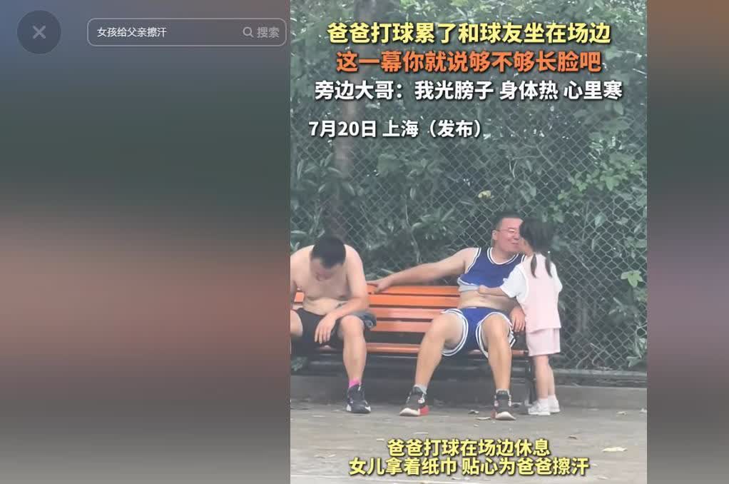 上海,一男子在球场打球打累了,便和球友坐在场边休息,结果男子女儿上前就为男子暖心的擦起汗来。而这一幕,让一旁球友羡慕嫉妒恨。 夏天的一个普通周末,在上海的一个小区篮球场上,几个中年大叔打得满头大汗。这时,一个36岁的大叔刚结束比赛,坐在场边和队友们喘口气。就在这时,温馨的一幕出现了。 大叔刚坐下,还没缓过神来,就见一个小不点儿蹦蹦跳跳地跑过来,手里还拿着条毛巾。是他4岁的小闺女。小姑娘踮起脚尖,虽然动作有点笨拙,但特别认真地给老爸擦汗,眼睛里都是心疼。老爸一开始愣了愣,接着就咧开嘴大笑,低头让闺女擦脸、擦脖子,还有手臂。 边上的队友们都看在眼里。有的人轻轻叹了口气,有的人偷着乐,更多的人则是羡慕得不得了。特别是有个光着膀子的大哥,嘴上啥也没说,可眼睛老往这边瞅。他一会儿低头扯扯衣服,一会儿抬头望望天,假装不在意,其实心里头已经波澜壮阔了。小女孩的动作虽然有点儿生疏,但满满的都是对爸爸的爱。她爸爸呢,脸上洋溢着得意,不停地向球友们炫耀,就好像在说:瞧瞧,我女儿多贴心啊! 这场在篮球场边的小温馨,最后在大家的笑声和羡慕眼光中结束了,可它让人明白了:幸福啊,很多时候就藏在孩子那些不起眼的小动作里。