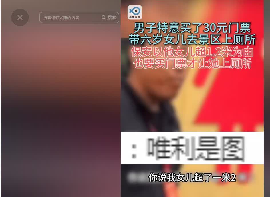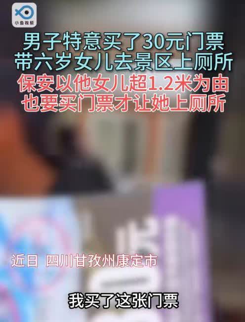 真就无法无天了?因洗手间在景区内,男子特意买票带女儿进去上厕所,保安却拦住其女儿不让进,男子争辩几句还被保安推搡,男子气愤:我们不尿了! 网上疯传了一段视频,讲的是四川一个景区里的事儿。有个爸爸带着女儿去景区玩,因为女儿想上厕所,他们就买了票进去。可到了厕所门口,却被保安给拦住了,两人吵了起来。 爸爸说,他女儿身高没到要买票的标准,买了他一个人的30元票,女儿就能免费进。但保安非得说女孩超过一米二了,得上厕所就得再买票。爸爸一听就火了,觉得自己已经买了票,就想带女儿上个厕所,还得再掏钱,这也太不讲理了。于是他就拿出手机开始录视频,质问保安:“我们都买票了,上个厕所都不行?” 保安呢,一脸不在乎,还嚼着口香糖,就一个劲儿地让补票。吵着吵着,爸爸说保安还推了他,气得都快崩溃了。小女孩看到爸爸这样,就懂事地说:“爸爸,我们不尿了。”最后,父女俩只好放弃上厕所,走了。视频在网上传开后,大家议论纷纷。有网友说保安太狠心,不管不顾;但也有人亲眼看到,那女孩个子明显超过免费线,那个男的硬闯了进去。两边说法都不一样,真相让人摸不清头脑。 到现在,景区还没给个正式说法,这事儿还在闹得沸沸扬扬。不管谁对谁错,这事儿又让大家开始热烈讨论起景区的免费标准和服务态度来了。