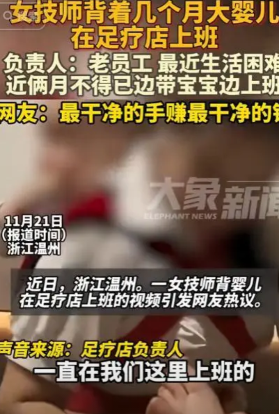 看哭了!浙江温州,一女子因家庭贫困,只能每天背着几个月大的婴儿在足疗店上班,老板理解她生活的不易,同意她上班的方式,网友:用最干净的手赚最干净的钱!