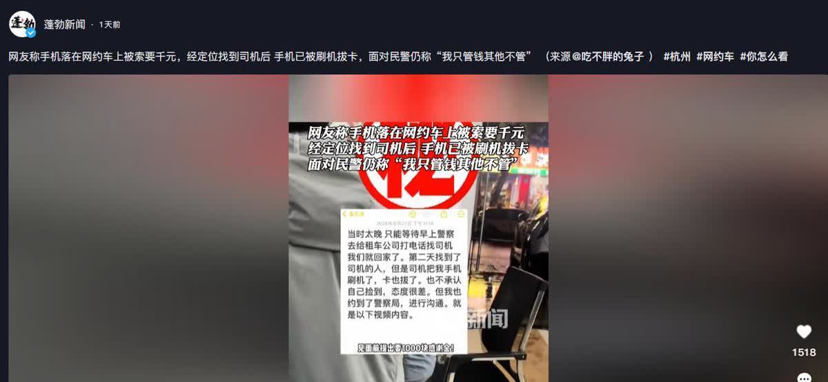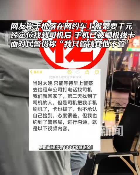 不嫌丢人吗?浙江杭州,女子出差乘坐网约车,下车后发现手机遗失在车里,第二天在民警协调下找到司机,却发现手机已经被刷机了,而且司机还索要1000元的报酬,一旁的民警看不下去,在中间进行调和,不料,司机却语出惊人怒怼:你别在这装好人! 在浙江杭州,有个女士出差完坐网约车回家,结果下车时把手机忘车上了。这手机对她特别重要,里面全是工作资料和个人信息。她发现手机丢了以后,急得像热锅上的蚂蚁,到处找都没找到,最后只好找警察帮忙。 警察通过一些办法,终于找到了那个网约车司机。可让人没想到的是,司机不但没主动还手机,还把手机给刷机了,卡也给拔了,所有数据都没了。更气人的是,他还跟女士说要给1000块钱“辛苦费”才肯还手机。女士没办法,只好答应给钱,但见面的时候才发现手机已经被弄得没法用了,数据也找不回来了。警察好心劝司机归还手机,可那司机特别蛮横,说:“要不是我主动送回来,你们哪儿找得到?手机没被我拆了就该偷着乐了。”他还冲着警察大喊:“你别在这儿装好人!”根本不把职业道德和法律放在眼里。 最后警察施压,司机才把手机还了回来,但里面的数据全没了,那女子损失可大了。这事儿让大家都很生气,也让人们又开始关注起平台和行业的监管问题了。
