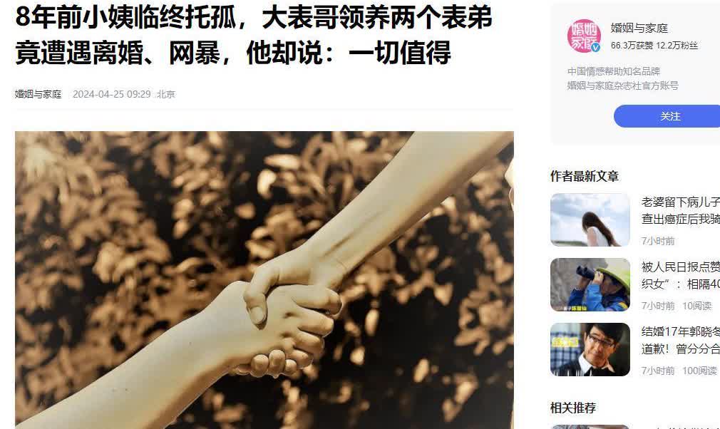 2024年4月媒体报道,湖南一女子临终之际,想把两个幼子托付给亲戚抚养,可亲戚们互相推诿,女子非常难过,眼看孩子只能送孤儿院了,这时,侄子站了出来:让两个表弟跟着我吧,我就是讨饭也要把他们养大。 2016年冬天,湖南有个单亲妈妈叫刘福兰,她老公走得早,一个人打几份工拉扯大两个娃。可到了年底,她查出肝癌晚期,知道自己时日不多了,就想找亲戚帮忙照顾下孩子,可谁也不想管。刘福兰心里别提多难受了,觉得孩子可能得去孤儿院了。就在这时,她33岁的表哥尹文涛站了出来,说:“我来照顾孩子!” 尹文涛其实有自己的小家庭,和老婆还有两个双胞胎女儿,过得也不宽裕。但他就是看不得俩孩子没人管。这一答应,他就带着俩孩子,一过就是八年,不容易着呢。头两年,九口人挤在那只有40平米的小旧屋里,日子过得紧巴巴的,连吃饭都成了大问题。为了让大家有口饭吃,他白天在工地上卖力干,晚上还得去餐馆当服务员,一天忙到晚,得干上十六个小时。这么一来二去,家里压力山大,老婆实在受不了,就带着女儿走了,跟他离了婚。 留下他一个人带着三个孩子,网上还有人骂他,说他这么做是为了博取同情,是个不负责任的爸爸。可他没被打倒。2019年,他在工地上受了伤,之后就去当了快递员,虽然钱少了点,但时间自由,能多陪陪孩子。 到了2020年,政府给他们申请了便宜点的房子,日子这才慢慢好转起来。他那两个表弟也挺争气,老大奇奇2023年考上了长沙邮电大学,老二成成也升上了高中。尹文涛开始在短视频上分享他们的生活,没想到感动了好多人,也得到了不少社会上的帮助。现在,八年一眨眼就过去了,俩孩子都已经长大成人。尹文涛虽然经历了离婚、受伤,还有人们的议论纷纷,但他从没后悔过自己当初许下的诺言。他常说:“只要他们能健健康康地活着,我所做的一切就都值了。”