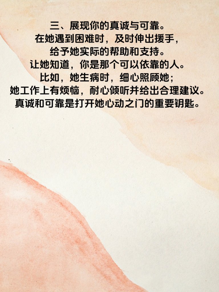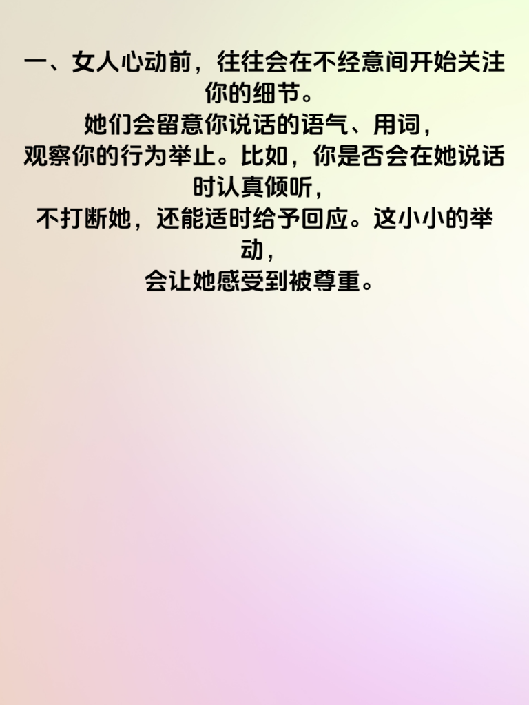一、女人心动前,往往会在不经意间开始关注你的细节。她们会留意你说话的语气、用词,观察你的行为举止。比如,你是否会在她说话时认真倾听,不打断她,还能适时给予回应。这小小的举动,会让她感受到被尊重。 二、制造一些小惊喜也很关键。不需要多么昂贵或盛大,一份她喜欢的小点心,一本她一直想看的书,都能让她心里泛起涟漪。在平淡的日子里,这些小惊喜就像一颗颗甜蜜的石子,投入她的心湖,激起层层心动的波澜。 三、展现你的真诚与可靠。在她遇到困难时,及时伸出援手,给予她实际的帮助和支持。让她知道,你是那个可以依靠的人。比如,她生病时,细心照顾她;她工作上有烦恼,耐心倾听并给出合理建议。真诚和可靠是打开她心动之门的重要钥匙。