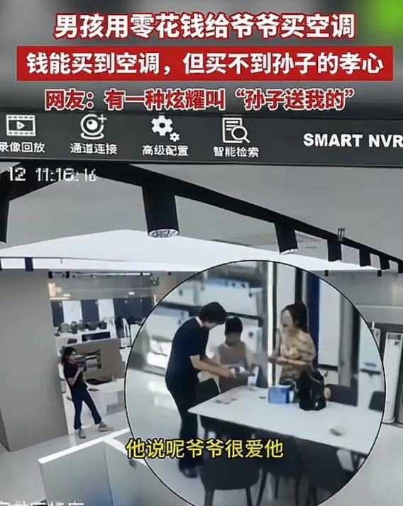 男孩说:“爷爷很疼爱我,他的空调太旧了,得买一台。”
