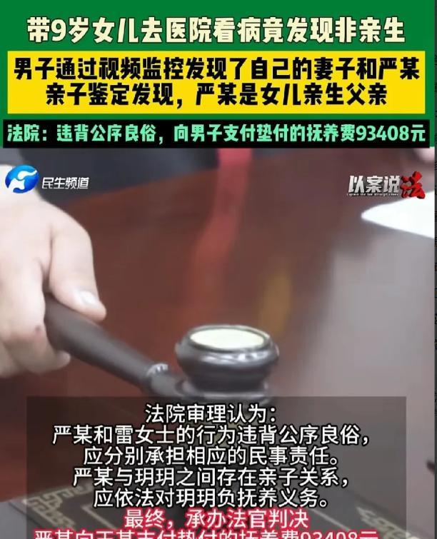 湖北枣阳,男子带9岁女儿去医院看病时,发现女儿血型与自己不匹配,男子越想越不对,赶紧做了亲子鉴定,结果显示,女儿果然不是他亲生的。同床共枕的妻子竟给自己戴了这么大一顶绿帽子,男子气炸了,开始暗中调查,很快在监控视频发现了妻子的秘密,也找到了孩子的亲生父亲。为了出这口恶气,男子将妻子和第 三者告上法庭,索赔11万。 根据8月12日河南民生频道的报道,张先生(化名)和自己的妻子俩人早年间是通过他人介绍结识的,当初二人都已经到了结婚的年龄,所以俩人便迅速地举办了仪式,想着婚后在培养感情! 随后没多久的时间,张先生和妻子有了孩子,顺利的生下来了一个可爱的女儿,夫妻二人的感情,张先生自我感觉还特别不错,因为他为了这个家庭,可谓是尽心尽力,每天努力工作,就是为了能让妻女过上更好的生活! 随着时间的流逝,自己的女儿已经9岁了,但是最近女儿一直生病,并且不论张先生带着女儿看什么医生,吃了许多药,始终不见好转,看着女儿难受的样子,张先生直接带着女儿来到了大医院检查! 经过医生的一番检查,决定让女儿抽个血,然后检查一下到底是怎么回事,顺带给孩子做了一个血型检测,随后张先生便在医院静静等待着检查结果,想着赶紧让女儿的病情有所好转! 然而检查结果出来后,张先生连忙拿给医生看,这时候他竟然知道,自己的女儿血型竟然和他不同,这时候张先生就有点纳闷了,自己的亲生女儿血型竟然与他不同,感到疑惑的他连忙做了一个亲子鉴定,结果竟然表示排除张先生为女儿的生物学父亲! 看到这一结果,张先生愣在了原地,但是他并没有直接质问妻子,而是默默的进行调查,果然在他的一番调查下,发现自己的妻子竟然和一个男人特别亲密! 紧接着他通过了自己的一番调查,经过自己仔细的寻找下,找到了这个男人的一些头发,立即将这些毛发送到了鉴定机构,检查显示,这个男人和女儿存在亲子关系! 愤怒至极的张先生再也忍不住了,直接将妻子和这个陌生男人告上了法庭,觉得妻子违背公序良俗,要求妻子和男子赔偿自己11万元的补偿! 最终,承办法官判决,男子应向张先生支付抚养费,93408元! 这件事很快被曝光在了网上,事件一经曝光,在网上迅速地,引起了众多网友的热议: 有的网友称道:“没发现的多了。有的养到老了60多岁才发现,孩子都30多了。一次输血才发现不是自己亲生的!” 还有的网友说道:“仅仅是赔偿付出的钱财,对破坏婚姻通奸没有法律制裁吗?没有精神损害赔偿吗? 中华民族传统价值观已经被西方渗透得体无完肤,通奸古代是入罪的!” 那么,对于这件事,大家有什么看法? 信源:河南民生频道