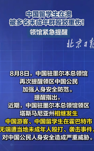 而这起暴行并非孤例。把时间拨回五月,远在悉尼,一对华人夫妇只因在住所附近讲中文,就被一群青少年围殴,妻子手臂骨折。这些针对亚裔,特别是中国公民的街头暴力,如同一场瘟疫,在澳大利亚东南海岸接连上演。