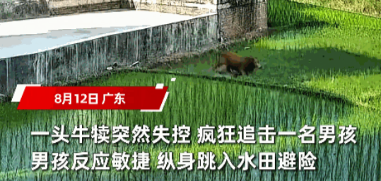 “这个小男孩火了!”8月12日,广东,一男孩在村里玩耍时,一头牛突然因为天气炎热而“发疯”,小男孩被疯牛狂追不止,眼看着就要撞上的时候,男孩突然纵身一跃跳进水田,疯牛竟也跟着跳了进去,结果瞬间摔倒在地!网友:这孩子脑子实在是够机灵啊。