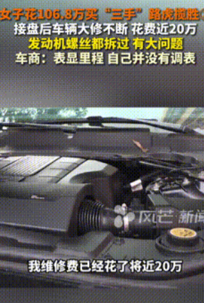 没实力硬装的代价!”湖南长沙,一女子看中170多万的路虎,可因为买不起,便在二手车市场找到标价106.8万,9成新的3手路虎!女子心动极了,车行表示车子才2万公里,她马上将车买下。结果之后小毛病不断,维修花了20多万。女子气的要卖车,送去另一个车行被告知这是“调表车!”