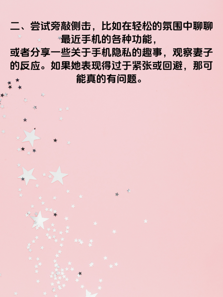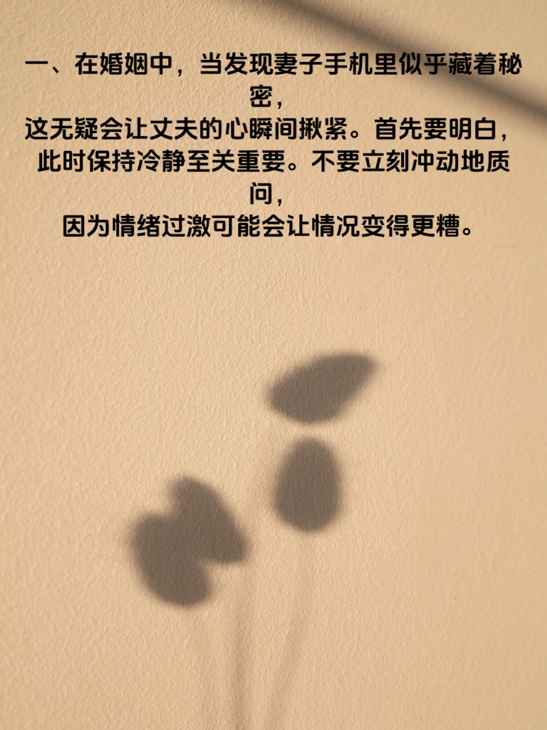 一、在婚姻中,当发现妻子手机里似乎藏着秘密,这无疑会让丈夫的心瞬间揪紧。首先要明白,此时保持冷静至关重要。不要立刻冲动地质问,因为情绪过激可能会让情况变得更糟。 二、尝试旁敲侧击,比如在轻松的氛围中聊聊最近手机的各种功能,或者分享一些关于手机隐私的趣事,观察妻子的反应。如果她表现得过于紧张或回避,那可能真的有问题。 三、找个合适的时机,真诚地与妻子沟通。告诉她你对婚姻的重视,以及你希望彼此坦诚相待。但注意语气要温和,让她感受到你是出于关心,而非指责。 四、如果妻子愿意倾诉,认真倾听她的心声。也许她藏着的秘密并非是对你的背叛,而是有自己的苦衷。通过倾听和理解,共同寻找解决问题的方法,让婚姻重回正轨。