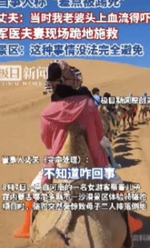 花钱买罪受!河南一男子带着妻子和儿子在沙漠坐骆驼,结果骆驼受惊,直接将母子摔下去,差点就被踢死,头上更是血流不止,好在有军医夫妻的救助,才活了下来,不过事后景区的回应,却引起了网友的激烈讨论:贫穷又救了我一命! 出门旅游,大家都是图个开心,想要体验一些不同的项目,但是谁能想到旅行的风险与享受也是并存的。 近日,河南一名男子带着自己的妻子和儿子到内蒙古鄂尔多斯沙漠景区游玩,因为好奇,妻子和儿子还花钱体验骑骆驼,毕竟这可是古代人在沙漠的主要出行工具。 本来按照预想,应该是母子俩在骆驼上摆好造型,等待美美的照片出炉,结果没想到还没等母子俩摆好姿势,骆驼直接不干了,直接发起疯,将驼背上的母子二人甩了下去,之后更是疯狂踢打。 因为是在沙漠上,落地的时候并没有很大的伤害,但是妻子却不幸被骆驼踢到了额头,顿时血流不止。 打了120急救,却还是需要等待对方的到来,就在男子和儿子不知所措的时候,一对游客突然站出来亮明身份,他们自称是军医,之后在他们的帮助下,受伤的妻子总算是得到了救治,事后被送往医院进行了检查。 不过对于这件事情,景区的回应引起了不少网友的热议,景区表示:这种事情是没有办法完全避免的。 有网友说:原来骆驼也不想上班,可以体谅,之前骑马还遇见马打架的,这种确实没有办法控制! 还有网友吐槽:吸取经验了,决定放弃去沙漠骑骆驼了,算了一下,为了安全还省下了钱。 对此,你怎么看?