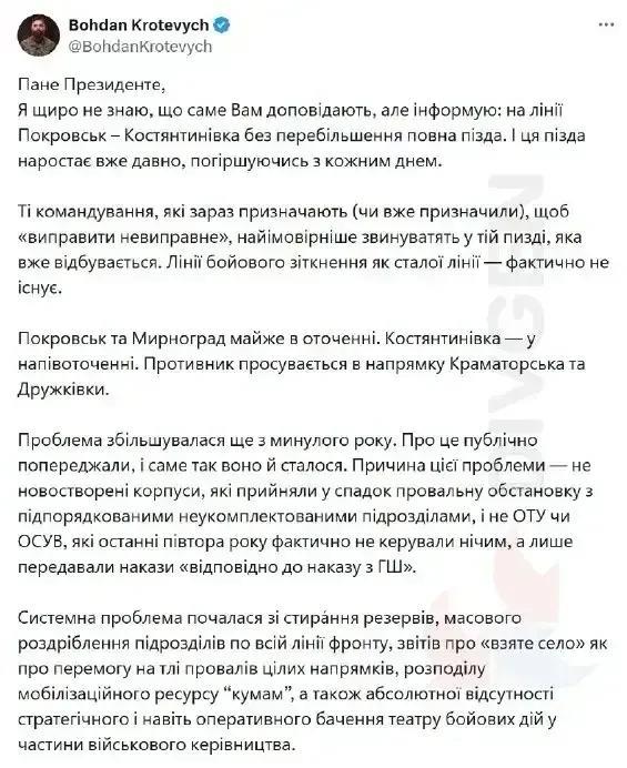 乌克兰总统泽连斯基8月12日接受CNN专访时表示:“我们不会离开顿巴斯,我们不能这样做。如果俄罗斯占领了我们的防御工事,他们过几年后会以此为跳板,对乌克兰发动第三次战争。” 泽连斯基还在向本国人民宣示,如果美俄峰会商定要乌军撤离顿巴斯,又或者乌军主动弃守顿巴斯,与他本人无关。11日臭名昭著的乌克兰极右翼武装“亚速营”(现乌军第三突击旅)参谋长波格丹.克罗杰维奇在电报频道向泽连斯基发公开信称(图3~4),波克罗夫斯克(红军村)和米尔诺格勒几乎被包围,康斯坦丁诺夫卡形成半包围,前线状况一天比一天差。该部队可是有名的“逃跑大王”,数次拒绝执行乌军总参谋部命令,增援阿夫迪耶夫卡却带头逃跑致该重镇失守。今天红军村外围被俄军向前推进15公里,看来“亚速营”又做好了逃跑准备。