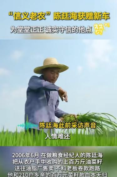 这样的人品全国都罕见!湖北宜昌,一老农因厂家失信卷款跑路,导致他欠下巨额债务,不料他却从没想过要逃避,坚持还债19年,如今依旧如此,有人也曾劝过他可以跑路,但他说的一句话,却让人无比感到动容! 陈延海从从家之后就开始从事粮食收购这一行业了,一路上就算不管遇见什么大大小小的苦难他都可以很好的化解掉。 所以村里面的人民对他十分信任,一到丰收的季节,村民们种的粮食谁也不卖全部都卖给陈延海,一向都不给村民拖欠粮食款的他却因为一件事情迫不得已拖欠村民了很多钱。 2006年的时候,陈延海从村民的手上收上来了上百斤油菜籽,随后他便找到了一家收货商,说是这家收货商可以高价回收,陈延海想这样不就可以为农民争取更多的利润了。 不料他将这上百斤油菜籽给收货商送去之后,老板就直接卷钱跑路了,陈延海听到这件事情之后一时间很难接受,因为就他现在的经济水平根本就拿不出那么多钱来付给村民们。 等他冷静下来,就硬着头皮与村民们说了这件事情,不料村民们不仅没有责怪他,反而都纷纷说道;“不用着急,他们的钱不用着急给,等他有钱了再说”。 听到这陈延海顿时红润了眼眶,他更觉得自己对不起村民了。 19年以来陈延海不管多么劳累,生活多么节俭,挣到钱之后第一时间就去给村民们送去。 其实在这期间,也有人给他说过,他也可以像那个老板一样,拍拍屁股走人,这样就不用还那么多钱了,但是他严肃的说道:“做生意就是要诚信,他不会那样做的”。 然而就是因为他这一诚实守信的精神,他先后获得为“中国老好人”、“第九届全国道德模范提名奖”。 近日当地的单位知道了陈延海的旧货车已经达到了报废水准,所以就组织当地的爱心企业,几个人共同出资给他捐赠了一辆新的大货车。 如今这样的社会,能有几个人能像陈延海一样,做到诚实守信的。