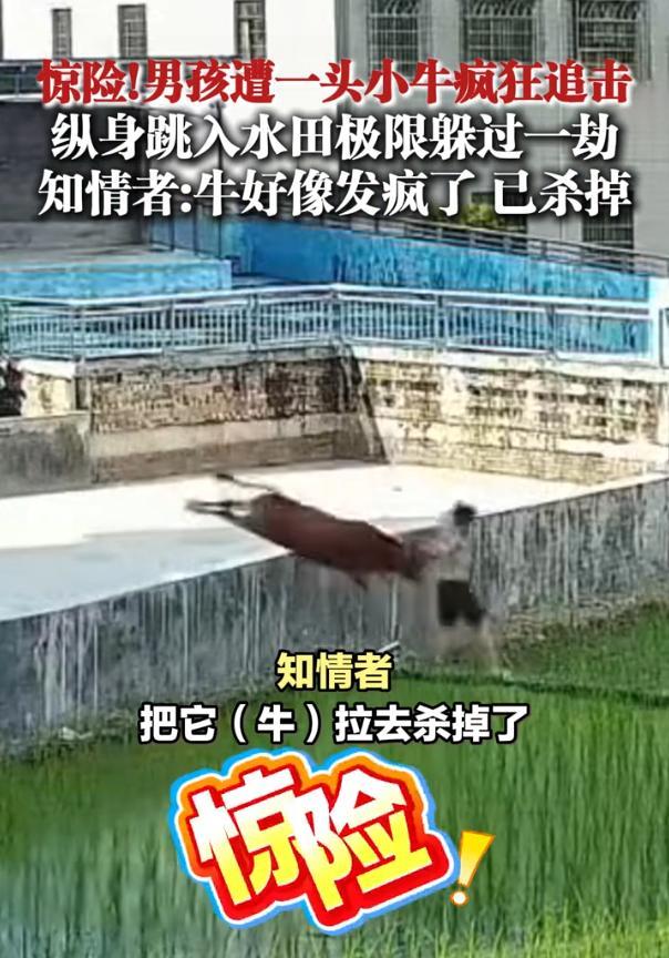 太吓人了!广东,一名男孩在自家门口玩得正起劲,突然一头牛犊闯了过来,像见了猎物般穷追不舍。男孩反应机敏,情急之下跳进旁边水田,没想到这头"倔牛"也跟着扑通跳下 现场目击者描述,那天下午天气闷热,男孩像往常一样在村口玩耍。突然一头牛犊不知受了什么刺激,低着头就朝男孩冲过去 男孩回头一看,牛犊眼睛发红,鼻孔喷着粗气,吓得拔腿就跑。前面是水田,后面是疯牛,男孩顾不得多想,一个猛子扎进田里,心想牛总不会跟着下水吧 谁知这头牛犊也是个"愣头青",根本不管前面是水是泥,跟着就跳了进去。结果因为体重太大,加上冲劲过猛,四条腿直接陷进泥里,跪在那儿动弹不得 这短短几秒,男孩抓住机会跑开,才算脱了险。后来有知情人说,那头牛的状态很不正常,已经被处理掉了 说实话,这个事并不可笑,甚至挺让人后怕的,我们都听过一句老话,叫初生牛犊不怕虎,牛犊虽然体型比成年牛小,可力量和冲撞的惯性并不比人差多少,尤其是在突然的情况下,小孩根本没有反应时间。如果换成是在硬地上或者牛没有被绊住,后果很可能会不一样 对于小孩来说,家长最好提前告诉他们遇到动物异常靠近该怎么躲避,比如找高处、躲进屋子等 #男孩遭疯牛追击 纵身跳入水田躲过#