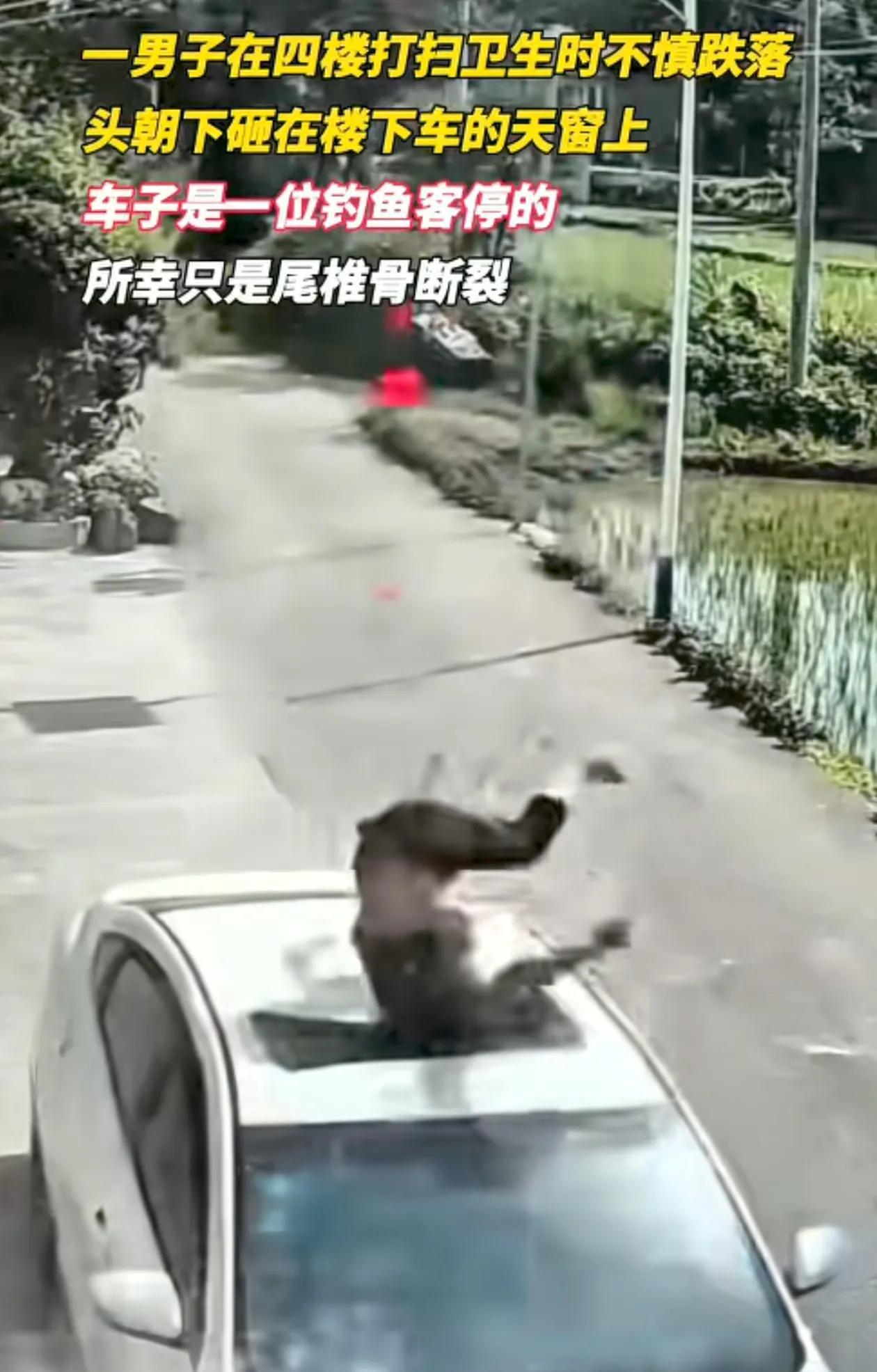 碰上了生命中的贵人!8月10日,湖南一男子在家打扫卫生,脚下一滑不小心从4楼跌落下去,不偏不倚,正好砸到了停在路上的轿车上,最幸运的男子只是尾椎骨受伤,其它并无大碍! 当时楼下的这辆车,是一位钓鱼佬临时停在这里的,估计钓鱼的大哥也没想到他车会被人砸,更没想到因此还救了别人一命。 看视频,男子是头朝下砸在车的天窗上,随后又弹到地上,要是没有这辆车作为缓冲,男子的结局真就不好说了。 据了解,男子当时在房顶修补漏水,因为是光脚,踩到有水的地方打滑了,目前人还在医院,男子表示,后续会把车修好赔给车主。 也有网友表示,要是他的话就跟车主商量着把车买下来,毕竟命都是这个车救下的,光是修车,车主心里肯定膈应! 您觉得呢!