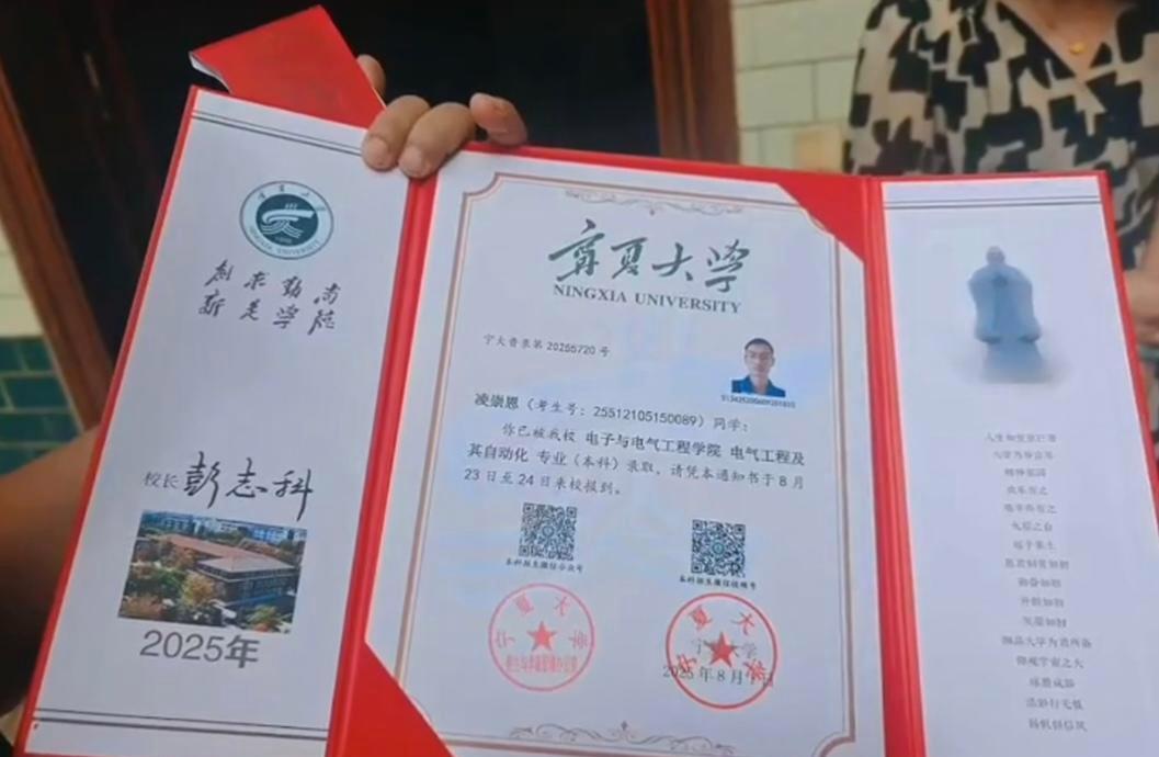 令人惋惜!四川凉山,男生高考597分被宁夏大学录取,本来是件高兴的事,结果录取通知书送到他家的时候男生已经因病离世,父母看着录取通知书眼泪止不住的流,同学纷纷前往他的家送他最后一程,老师含泪写下一封寄到天国的录取通知书悼念这位不幸且身残志坚的少年!网友:“看哭了”。 在四川凉山会理,一张大学录取通知书,终究是没能追上一个少年的脚步。当这份来自宁夏大学的喜讯抵达时,迎接它的不是欢呼,而是父母的眼泪和乡邻的哀悼。 597分,电气工程及其自动化专业。这个分数放在任何人身上都让人高兴,可对于18岁的凌崇恩来说,这是一个永远无法亲手触摸的遗憾。 凌崇恩这个农村少年,因脚部残疾,拐杖成了他身体的一部分。当同龄人在田埂上撒野奔跑时,他只能一步一挪,在家和学校之间缓慢的移动着。他的父母,就靠着种地和打零工的微薄收入,撑起了他读书这个唯一的、也是最大的指望。 而凌崇恩也用近乎严苛的勤奋,回报了这份沉甸甸的爱。他几乎把所有力气都用在了学习上,从不拿残疾当借口,成绩始终名列前茅。同学们的印象里,他总是那个微笑着、有礼貌的男孩。 有时为了多挤出点学习时间,他甚至可以省掉午饭。那个拄着拐杖,一手扶着楼梯,另一只手还紧紧攥着书本的身影,印在许多人的脑海里。他的乐观和坚毅,比任何话语都更有力量。 初一那年,他第一次鼓起勇气报名参加演讲比赛,结果因为紧张磕巴,没能入选。可到了初二,他又一次站上了那个舞台,演讲主题是《科技托起梦想》。他穿着一件洗得有些发白的校服,那根陪伴他多年的拐杖,被他擦得锃亮。 聚光灯下,他坦诚地讲起自己梦想的演变:“小时候,我的梦是能够如我的同龄人一样行走奔跑,妈妈含着眼泪告诉我‘不可能’。后来我的梦想是疼痛能少一点,不影响我读书……” 直到他从新闻里看到3D打印技术能为残疾人重塑骨骼,他兴奋地发现,科技或许就是那个能让梦想照进现实的答案。 他相信,科技终将填补命运的亏欠。这份对未来的清晰憧憬,也帮他拿下了比赛的三等奖。那一刻,台下的师生大概都从这个拄着锃亮拐杖的少年身上,看到了什么叫作“不灭的火种”。 可他终究没能等到3D打印出新的骨骼,甚至没能等到亲手拆开那封来自宁夏大学的通知书。他用尽了全部力气去奔跑,向着那个叫“未来”的地方,可最后却在终点线前倒下。 凌崇恩的书包再也不会出现在大学教室,但他的信念已刻进同龄人的骨血。在宁夏大学发起的“崇恩奖学金”名录里,在康复实验室的智能假肢图纸上,那个拄拐的灵魂长跑者,依然存在,他的墓碑不必刻姓名,人间自有万卷书,每一页都写着:慢慢走,总会抵达。