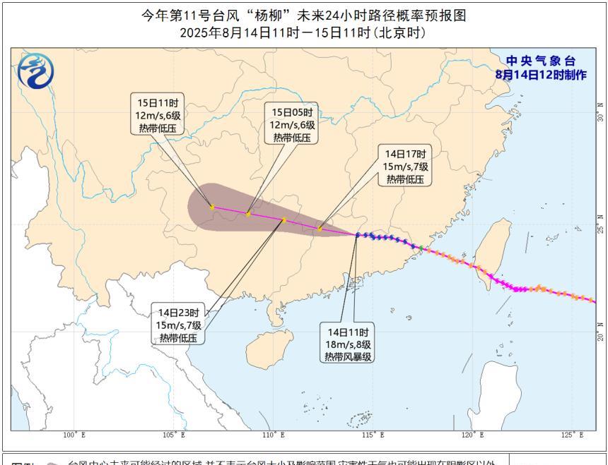 #广西天气# 【14日夜间“杨柳”将从桂东北进入广西 需加强防御】台风消息:今年第11号台风“杨柳”(热带风暴级)的中心今天(14日)上午10点钟位于广东省河源市境内,就是北纬24.5度、东经114.6度,中心附近最大风力8级(18米/秒),中心最低气压1000百帕。预计,“杨柳”将以每小时30-35公里的速度向偏西方向移动,强度逐渐减弱。 北部湾海面:今天晚上到16日白天,中到大雨、局地暴雨,偏东风4~5级、阵风6~7级;16日晚上到17日白天,大雨、局地暴雨,偏东风5~6级、阵风7级。请海上船只注意。 暴雨四级预警:今天白天,贺州、梧州、玉林、贵港、钦州、北海等市及桂林市南部有大雨、局地暴雨或大暴雨并伴有短时雷暴大风等强对流天气,其它地区多云有阵雨或雷雨、局地大雨。 今天晚上,桂林、柳州、贺州、河池、来宾、钦州、北海、防城港等市以及南宁、贵港、玉林三市北部有大雨到暴雨、局地大暴雨或特大暴雨并伴短时雷暴大风等强对流天气,其它地区有小到中雨、局地大雨或暴雨。桂东北有5~6级、阵风7~9级大风。 明天白天,柳州、河池、百色、玉林、钦州等市有中到大雨、局地暴雨并伴有短时雷暴大风等强对流天气,其它地区多云有阵雨或雷雨、局地大雨或暴雨。桂东北有5级、阵风7~9级大风。 15日晚上到16日白天,桂西和沿海部分地区有中雨、局地暴雨并伴短时雷暴大风等强对流天气,其它地区有阵雨或雷雨、局地大雨。 16日晚上到17日白天,沿海地区有阵雨或雷雨、局地大雨或暴雨,其它地区多云到晴局地有阵雨。(广西气象台14日12时发布预报)#台风杨柳最新路径#