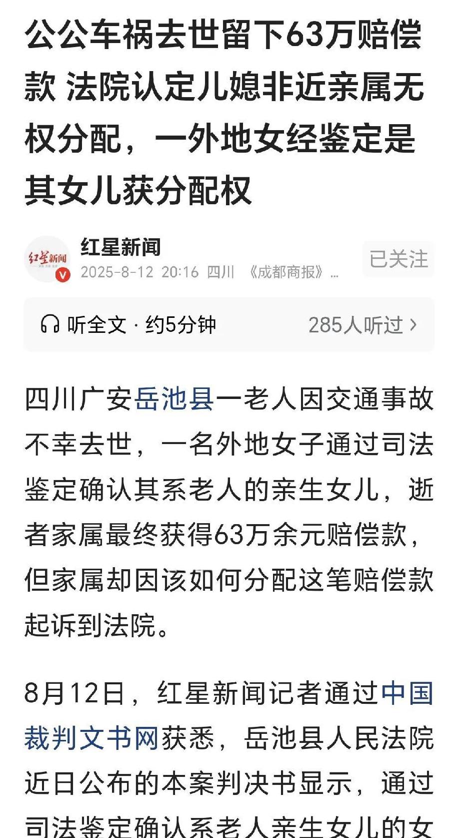 四川广安,一女子丈夫去世,她对公公不离不弃,公公衣食住行,全都由她支付,只要公公还在,两个孩子就有爷爷,谁知公公出门,遇车祸去世,女子给他办了后事,赔偿金63万,全部留给两个孙子,谁知这时,一陌生女子跳了出来,自称是公公亲生女儿,赔偿款有她一份,儿媳从未听说公公还有女儿,可做完亲子鉴定,儿媳傻眼,真相扑朔迷离,法院的判决令人大跌眼镜! 根据8月12日红星新闻的报道,张女士(化名)自从和丈夫结婚之后,他们一家子生活过得十分美好,因为公公当时还在世,家里的大多数事物,公公全部都自己包揽了,包括两个孩子上下学接送,孩子的爷爷做的十分的不错! 不仅仅如此,张女士和自己丈夫的感情也十分的好,谁知道在2014年的时候,张女士的丈夫因为意外不幸离世,留下了张女士和两个孩子还有孩子的爷爷相依为命! 虽然丈夫永远离开了她,张女士为了这个家庭,为了自己的两个孩子,并没有选择离开,而是承担起了这份责任,并且对自己的公公,还是和以前一样,并没有别的心思! 就这样张女士以为家里的生活会平淡的过下去,自己好好照顾孩子的爷爷,然而孩子的爷爷也遭遇了不测,在一天老爷子外出散步的时候,不慎遭遇了一起交通事故,造成老爷子永远的离开了人世,孩子也没有了自己的爷爷! 张女士为老爷子办理了丧事,并且因为老爷子的意外离世,张女士和她的两个孩子,得到了63万元的赔偿款,收到这笔赔偿款之后,张女士表示这笔钱全部都是两个孩子的,并且将来孩子结婚买房、购车这笔钱还不够,自己还要努力的赚钱,给孩子最好的生活! 但是就在这个节骨眼上,一个陌生女子突然跳了出来,对方表示自己是老爷子的亲生女儿,老爷子现在因为意外离世了,得到的赔偿款,应当有她的一份子,她找到张女士就是为了瓜分老爷子的赔偿款! 一开始的时候,张女士根本不相信自己的公公竟然还有一个闺女,然而经过一番调查,原来这个女子是早些年的时候,自己的公公当初与前妻离婚后,公公的前妻生下了个女儿,而且孩子是公公的! 只不过这个女子一直都没有见过公公,从小就跟随着她的母亲生活,现如今她得知自己的亲生父亲离世,并且还得到了一笔不菲的赔偿款,现在找来就是想要分钱! 然而张女士却不愿意和对方瓜分这笔钱财,觉得这些钱应当是她两个孩子的,于是双方闹上了法庭,经过法院的多方面调查,最终判决,法院扣除掉老爷子的丧葬费后,剩余59.2万元分配如下:老爷子的女儿分得16万元,孙子孙女分得21.6万元,剩下的由张女士继承! 那么,对于这件事,大家有什么看法? 信源:红星新闻