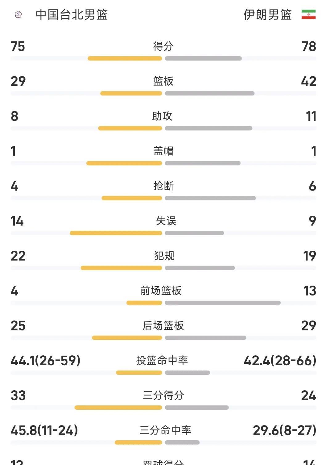 煮熟的鸭子飞了,双方各赢半场球!上半场中国台北的后场双枪陈盈骏和林庭谦发挥相当出色,特别是林庭谦拿到了台北男篮全场最高的的22分,加上陈盈骏的13分,两个人基本包办了全队一半的分数,但是下半场后半段风云突变,阿米尼砍下全场最高的30分11板2助率队疯狂反扑,中国台北最多领先伊朗男篮21分不但被追平,最终还被伊朗男篮78-75逆转战胜并淘汰中国台北男篮。当伊朗男篮疯狂追分的时候,台北男篮的教练显得束手无策,队员也有些慌张,台北男篮就此止步沙特男篮亚洲杯八强着实可惜,但是双方确实给观众奉献了一场精彩的比赛。