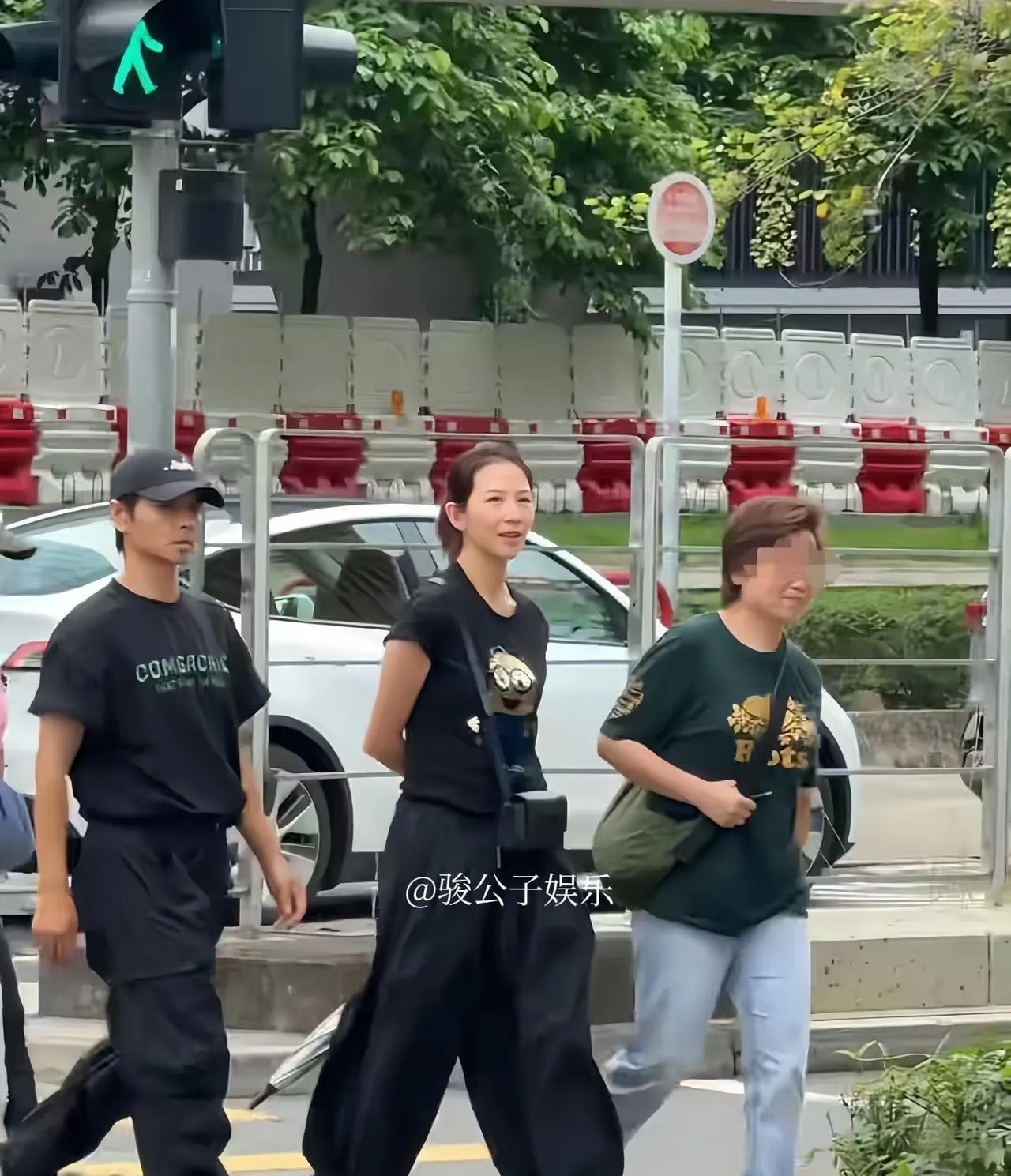 在香港街头偶遇蔡少芬夫妇,两人都穿着黑色衣服和裤子,打扮朴素接地气。值得注意的是