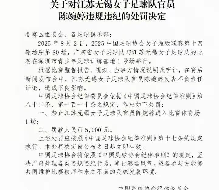 陈婉婷,无锡女足主教练,她说:体制问题不改,成绩再砸钱也没用。这是不当言论,不负责言论,负能量,被足协处罚,罚款5000元,禁赛1场。陈婉停,1988年出生于香港,不懂事。