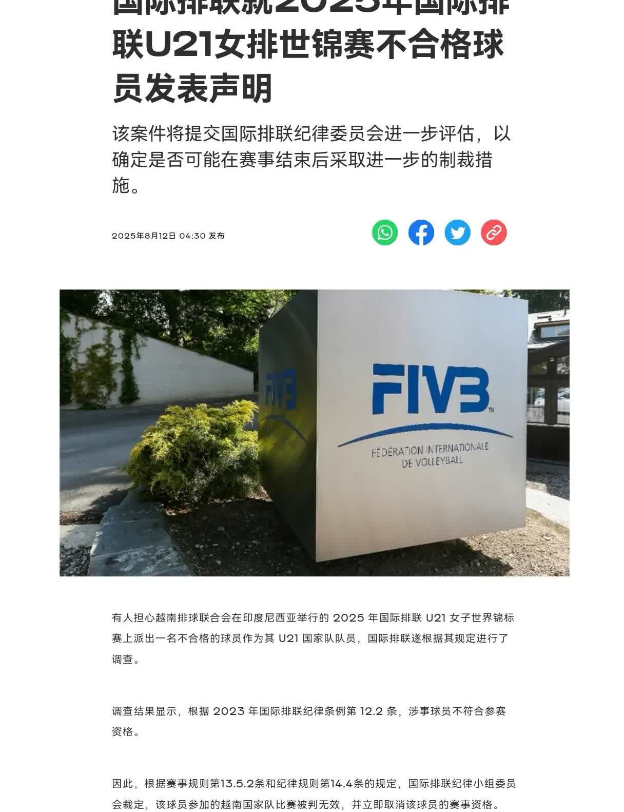 越南U21国家队仍然让邓氏红和阮芳琼参加比赛 据越南媒体《西贡解放报》报道,参加2025年U21世青赛的越南女排青年队两名重要球员仍被教练组注册参加接下来的比赛。报道标题为:尽管组委会制造难题,但越南U21国家队仍然让邓氏红和阮芳琼报名参赛。 “越南排球联合会秘书长黎智长(Le Tri Truong)于8月12日告诉《西贡解放报》:“赛事组委会要求核查邓氏红(Dang Thi Hong)和阮芳琼(Nguyen Phuong Quynh)的运动员记录。我们遵从了他们的要求,但这实在令人难以理解。” 因为邓氏红和阮芳琼参加了比赛并在2024年亚青女排U20锦标赛上进行了正式注册。在2025年印度尼西亚举行的世青女排U21锦标赛上,这两名球员参加了球队的首场比赛。如果有记录核查的要求,组委会应该在赛前的技术会议上提出来。现在,文件核查又被提了出来。我们已向国际排联技术委员会发送了一封电子邮件,阐明我们的观点,并确保球员们按照规定参赛。 8月12日,越南女排小组赛对阵波多黎各U21队,邓氏红和阮芳琼两名球员不在正式比赛名单上。本场比赛,我队以3比1获胜。 关于越南青年女排两名球员缺席比赛的消息,场边流传着不少。不过,教练阮仲灵也向《西贡解放报》确认,教练组仍将按规定注册这些球员,以参加球队接下来的比赛。” 另外,越南排联也发表的声明,表示尊重处罚决定,但正在采取法律行动,以维护运动员的权益,同时强调越南U21女排不会被对手的卑鄙手段吓倒,越南排联会永远站在她们身旁并正站在她们身旁。