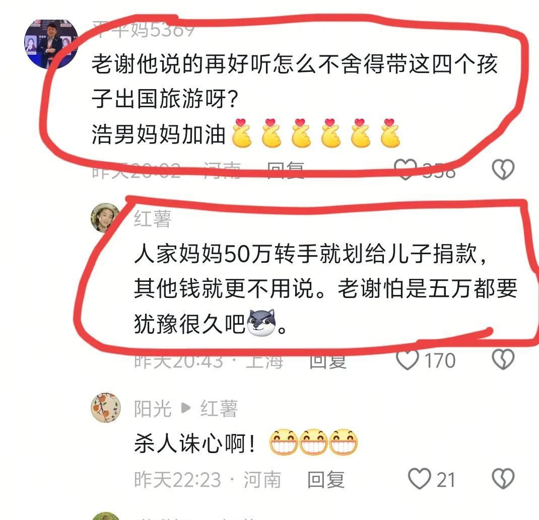 谢妈他们已到香港 她评论区一句话深深刺痛老谢 海军妈妈竟回复网友 真相令人扎心 你有没有刷到过那种评论?明明是别人家的旅游视频,底下的话却像小针扎得人心里发紧。前几天刷到谢妈带娃在济州岛坐船的视频,孩子们在海边跑,老太太笑得眼睛都眯成缝,本来还觉得“太棒了”,结果翻评论区一看,我晕,全是冲老谢来的——“说得再好听,也没带娃出过国”“谢妈50万 说捐就捐,老谢5万都得犹豫”。说实话,看完我这心里就跟搁了块石头,家家有本难念的经,咋就非得拿秤称着比呢? 谢妈一行人从济州岛到香港的事,估计好多人都刷到了。她那三个视频,不是在轮船上看海,就是陪孩子在沙滩上玩,嘎嘎开心的样子,谁看了不觉得“不容易,终于熬出来了”?本来想,网友们该跟着高兴才对,结果发现我想简单了。 有个评论说“老谢不舍得带4个孩子出国”,紧跟着就有人接“谢妈50万转手给儿子,老谢5万都得琢磨琢磨”,还提了一嘴“郑琴管着老谢的钱”。哎呀妈呀,这话说的,跟扒人家里账本似的。其实我懂,大家是觉得谢妈不容易,前几年她刚上镜时,说话磕巴,看着就跟社会脱节似的,二十多年失子,家里又散了,想想都郁闷。现在儿子谢浩南回来了,家里有了主心骨,小闺女都把哥哥当爸爸靠,这日子刚有盼头,咋就非得拉着老谢比呢? 这边谢妈的评论区吵得稀里哗啦,那边海军妈妈发了个台风天的视频,也挺有意思。她在福建,说台风来的时候有点怕,但风景“绝绝子”。本来以为就是个日常分享,结果评论区直接刷屏——“能干的妈妈养出优秀儿子”“幸福的妈妈养出优秀儿子”,还有人提醒她注意安全,她回复“谢谢大家关心”,看着倒挺暖。 网友还把海军在韩国玩的照片截到她评论区,估计海军妈妈看着就得偷着乐。说真的,换作是我,儿子能出去放松,我也得开心坏了。不过有网友建议海军毕业后去谢妈公司,说“刚毕业找工作难,谢妈人好,能发挥专长”,这想法是不错,但又觉得,年轻人的工作,是不是该让他自己“搞掂”?咱外人瞎操心,会不会有点“扯把子”? 总之,说什么都有,小编认为谢浩男一家都不容易,能出来玩更是好事情,大家还是放过他们吧#谢浩男认亲#