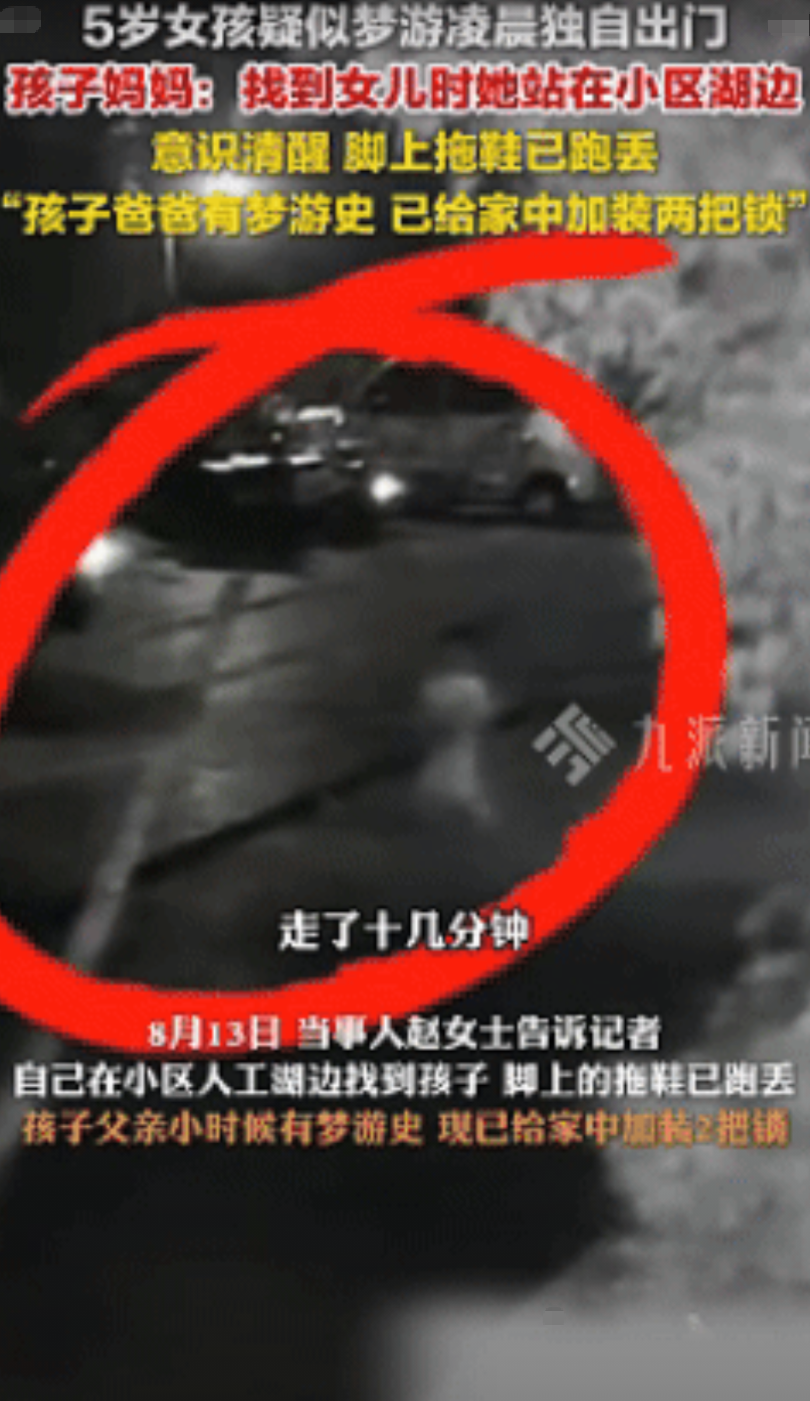 好可怕!江苏淮安,一妈妈凌晨2点突然惊醒发现5岁女儿不见了,更可怕的是,女子起床寻找发现家里大门敞开,怎料,等她查看监控竟看到了不可思议的一幕让她后背发凉。 当你睡到半夜突然惊醒,一转身发现原本躺在自己身边的孩子不见了,你第一反应会是什么呢? 江苏淮安的赵女士可是刚刚经历了这种惊悚的时刻,再回想起那天晚上的经历,赵女士依然冷汗直冒。 据赵女士表示,事发当天晚上凌晨2点,她也不知道怎么睡会在睡梦中突然惊醒,赵女士浑身冷汗直冒的愣在床上。 随后她双手摸了一下旁边直接懵了,原本睡在旁边的女儿此时却不见了踪影。 来不及多想赵女士赶紧拍醒了另一侧的丈夫起来寻找,结果找遍了全屋都没找女儿的踪迹,更可怕的是家里的大门此时却大肆敞开外边走廊漆黑一片。 难不成有人深夜溜进家里了?意识到不对劲赵女士赶紧打开手机查看客厅的监控录像,结果这不看不知道,一看后背瞬间冒出阵阵冷汗。 视频中显示,5岁的女儿从卧室出来,然后抱起地上猫玩了一会,随后居然自己打开了房屋大门然后头也不回的走出去了。 要知道女儿平时胆子特别小,别说半夜一个人出门了,白天都敢。 来不及多想赵女士赶紧出去寻找,结果在小区人工湖旁边找到了女儿,当时女儿就站在人工湖旁边,脚上的拖鞋都跑丢了。 好在赵女士发现及时女儿没出什么意外,但在回看当晚监控赵女士心有余悸,难以想象赵女士再晚几分钟会出现什么可怕的后果。 原来赵女士丈夫有梦游史女儿也遗传了,当天晚上就是梦游,现在赵女士给家里多装了两把锁以防再出现这种可怕的事情。