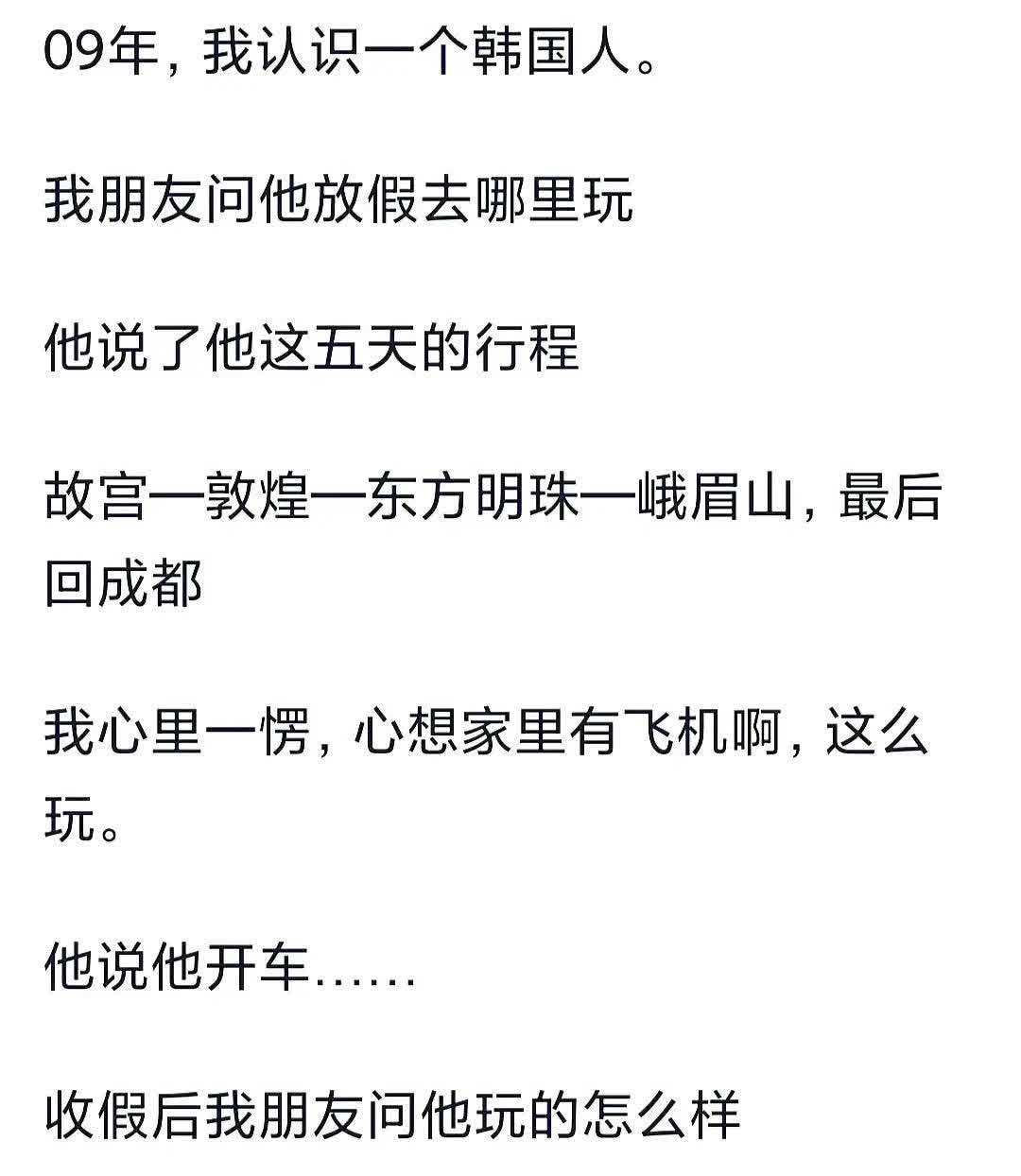 韩国人知道自己的国家小吗? 看过韩剧《信号》,里面第一集有一个儿童失踪案,警察找来找去找不到,最后他们警长发飙了,骂他手底下人:"这么小的大韩民国你们居然找不到一个失踪儿童”… 确实,38线到首尔只有50公里,也就相当于我们中国一个城乡结合地的距离。 有网友就说,去了韩国就知道,中国搞成渝经济带,就相当于别人要搞一个国家的经济! 而大国的好处,你哪怕月薪三千,在北京上海,也可以轻易吃上山东的蔬菜,东北大米,河北海鲜,南方水果,内蒙牛羊! 六一带准备儿子去野炊,买的物资有浙江义乌的烧烤工具,内蒙鄂尔多斯的木炭,黑龙江齐齐哈尔的拌牛肉,甘肃金昌滩羊肉串,辽宁锦州的撒料,还有广东本地的小零食[呲牙],就这一顿家常便饭,能不能把韩国人cpu干烧了? 还有韩剧里动不动就苦命鸳鸯天各一方就觉得很逗。新疆若羌县面积为20.23万平方公里,常住人口4.3万人;江苏省面积10.72万平方公里,常住人口8526万人;韩国面积10.33平方公里,人口5100万人… 不过我们不用嘲笑韩国,他真的不值得我们嘲笑,很多方面和我们差了不止一个量级,说他反倒显得我们器量小。