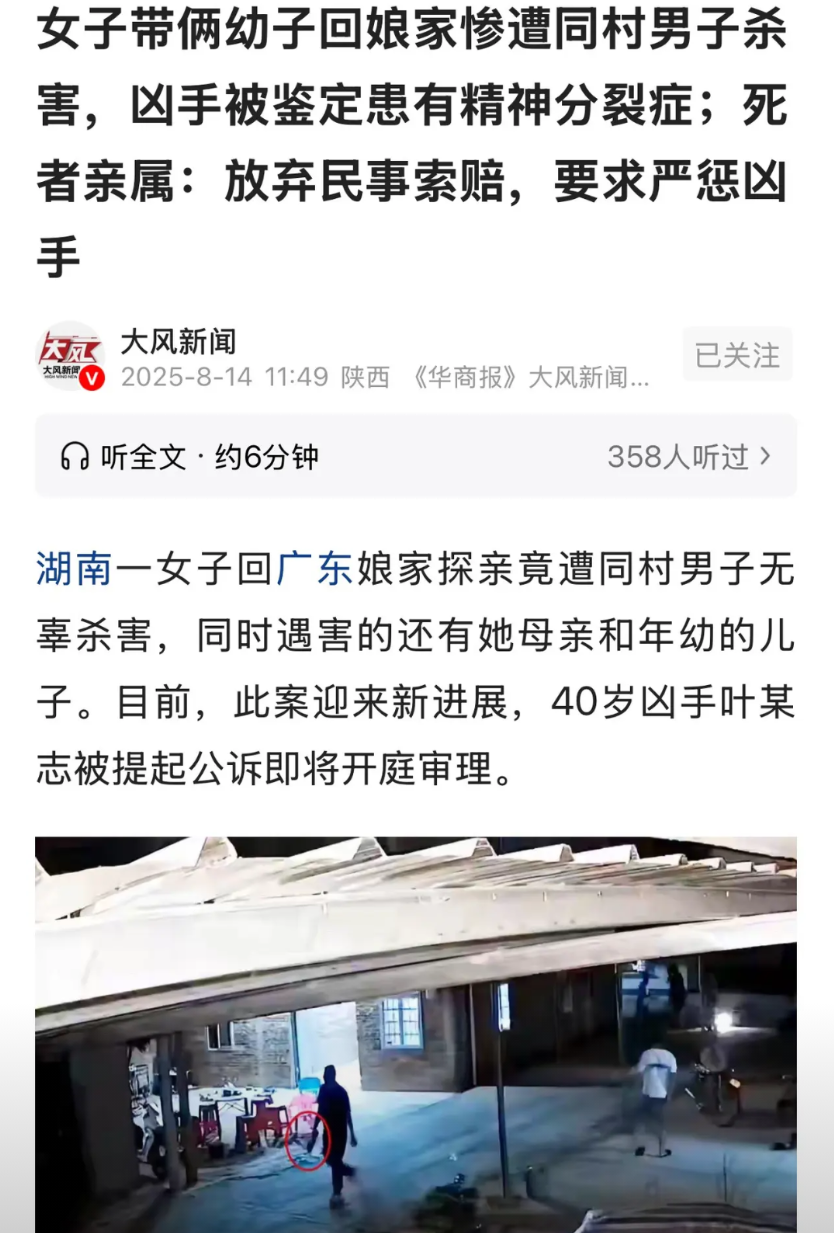 广东,女子女子带俩幼子回娘家,惨遭同村男子杀害。唯独2个月大的婴儿在屋里睡觉,逃过一劫。女子丈夫悲痛欲绝,放弃民事索赔,只希望凶手判处死刑。哪曾想,凶手被鉴定为精神分裂症,为限定刑事责任能力。女子丈夫不干了:他有驾照,能正常工作、开车,怎么就成精神分裂症患者了呢?