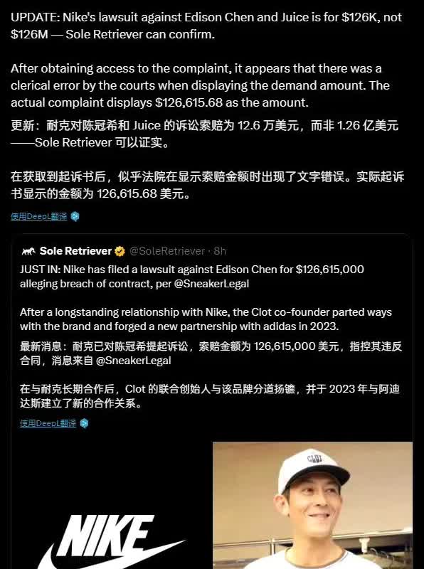 陈冠希惹上麻烦了,被索赔1.26亿美金! 8月13日,外媒报道,耐克公司在洛杉矶起诉陈冠希索赔90 万人民币,原因是陈冠希旗下公司拖欠货款。 陈冠希2006年开始就与耐克合作,但是2023年陈冠希转向了阿迪达斯,与耐克结束了近20年的合作关系耐克认为陈冠希构成违约行为,于是起诉。 此前洛杉矶法院还误将12.6万美元写成1.26亿美元引起轩然大波,经过舆论发酵后洛杉矶法院已将赔偿金额做了更正。 有点搞不懂,陈冠希的潮牌公司在全球潮流市场都拥有一定的影响力,为什么连12.6万美元这点钱都不能早点结清?再怎么说双方都合作过20年,买卖不成仁义在,这明显有点说不过去。 也有网友认为耐克这么大公司不会这么low,对多年合作伙伴索赔12万标的还错写成1.2亿,感觉是陈冠希和耐克自编自导的联合炒作。