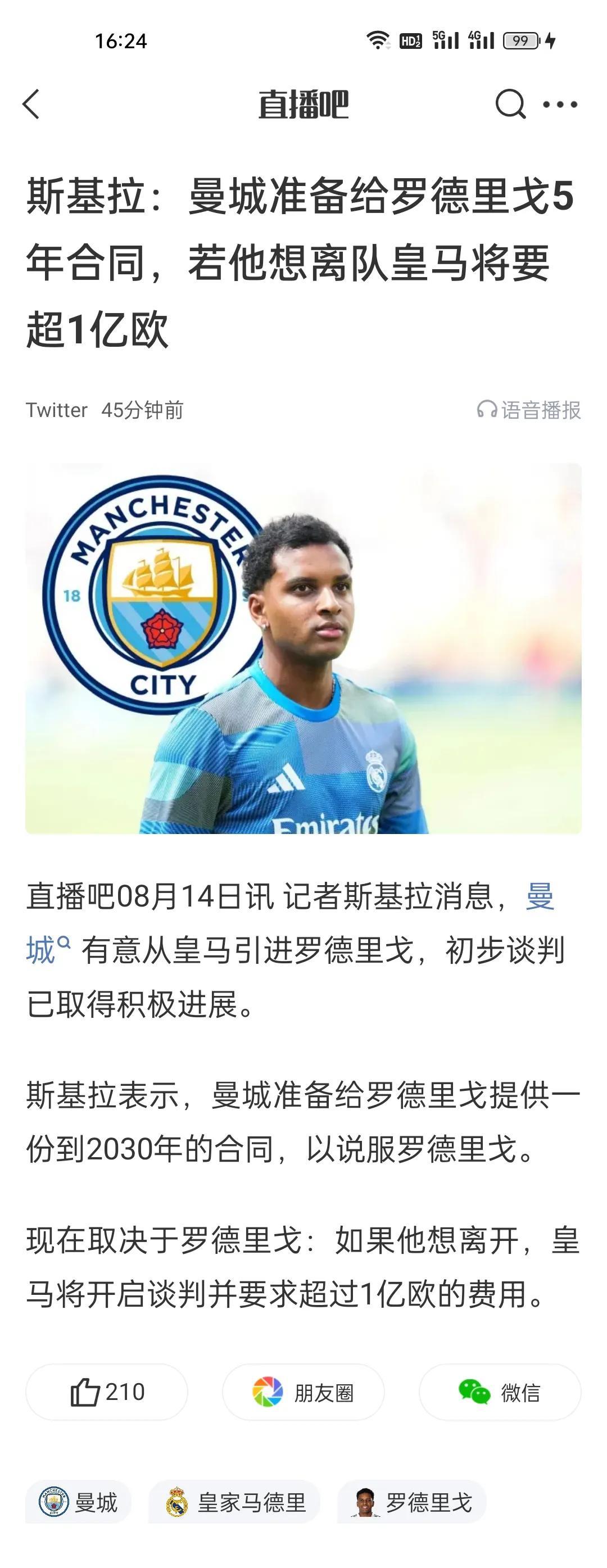 斯基拉:曼城准备给罗德里戈5年合同,若他想离队皇马将要超1亿欧。 罗德里戈挺符合瓜的战术要求的,球商高能传能控能传能射能回防,突破没那么犀利相对而言不会随意丢球,处理球相当稳健。 他在皇马感觉没完全爆发,除了那几次替补建功,看看去了曼城坐稳主力能踢出什么效果,不要瞧不上皇马买人的眼光,从皇马出来去了拜仁的罗本和国米的斯内德都是什么水平。 现在才25年,合同到28年呢,如果真想走,皇马也不会死咬1个亿,8000估计就放了,如果他自己不想走或者别的队低价求购,那就基本留下来了,老实说留下对皇马来说只能是丰富打法而不是累赘或者鸡肋,多线作战是需要阵容厚度的嫌贵的别买,去看看市面上有没有7000万能买这个级别的,而且才24岁,如果有有需要可以打前场任何位置,反正你们觉得他不值,但是谁用谁知道,就不做争论了。 今年转会市场两个未解之谜:8000万杰哥、1亿李哥从开始到结束,没人喊价。