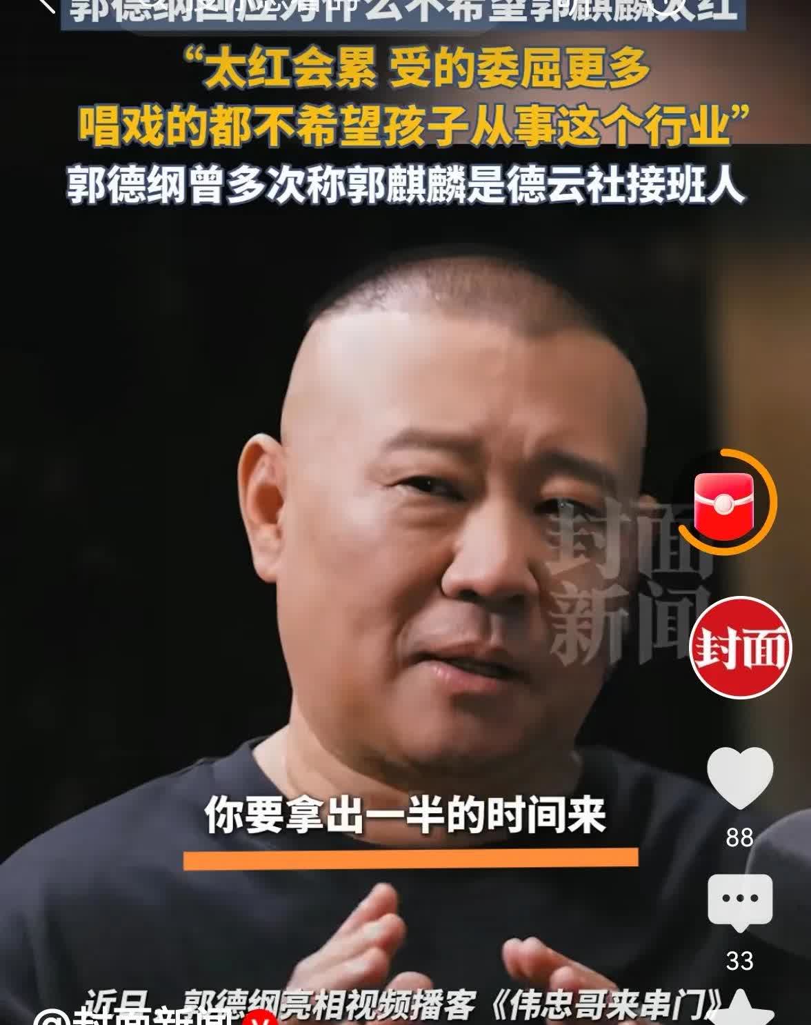 郭德纲最近回应为什么不希望大儿子郭麒麟太红时说:“进了这个行业(演艺圈),名气大