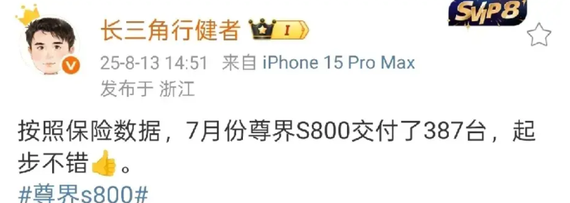 根据大V爆料,尊界S800在7月的上险量为387辆。