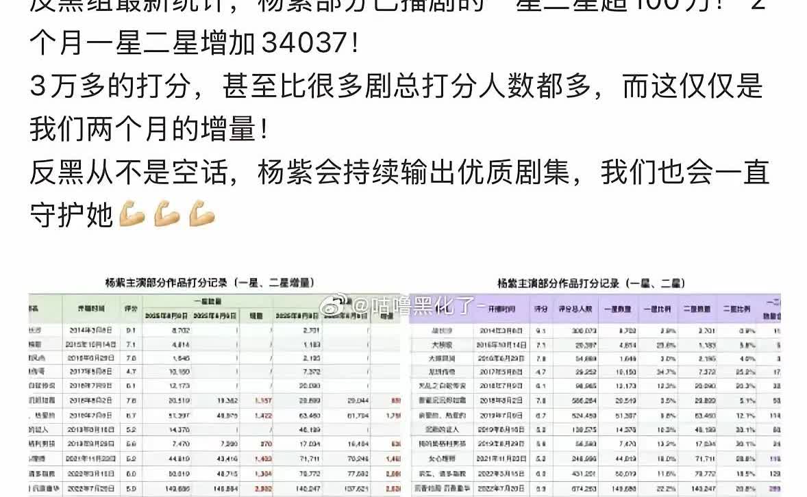 据反黑组最新统计,杨紫部分已播剧的一星二星超100万! 仅这2个月一星二星增加34037! 3万多的打低分,甚至比很多剧总打分人数都多。 就没有啥办法遏制一下粉圈的这种“流氓”行为吗? 好好的剧,给糟蹋了。祸害的不仅仅是演员,还有文艺作品本身,文化里艺术的影响力。 虽然说,这种“掐架”多半都是相互的,可在粉圈,由于杨紫的独树一帜,她早已经成为了很多爱豆粉的眼中钉。 无论是男爱豆的粉丝还是女爱豆的粉丝粉丝,纷纷都针对杨紫下手。。。 可这种不公平还要持续,且永久持续。 虽然是让人无语。。。 但还要坚持下去,不是吗? 没有最好,只有更好,支持