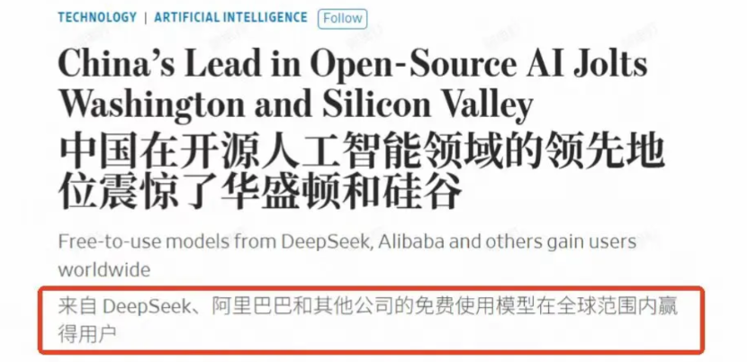 更讽刺的是,这反而加强了中国自主研发和突破外部技术封锁的动力,促使中国AI的逆袭——华尔街日报最新实锤:阿里Qwen(通义千问)已让华盛顿和硅谷集体失眠! 报道标题直指《中国在开源人工智能领域的领先地位震惊了华盛顿和硅谷》。
