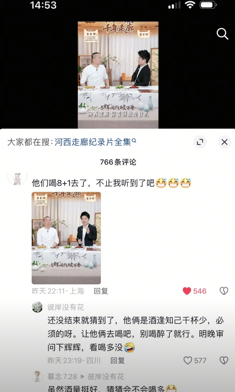 粉丝们听完让人荡气回肠的《河西走廊之梦》,忍不住去评论区蛐蛐董宇辉,担心他喝多了,准备晚上上播的时候问问。